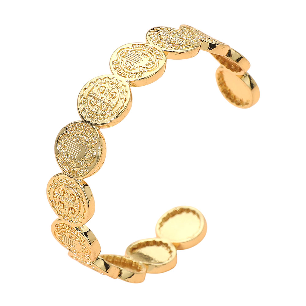 Details • Size : 0.5" H • Cuff • Eye-catching adjustable cuff bracelet designed with a row of coin-inspired motifs for a timeless, symbolic look. This versatile bracelet offers a comfortable fit and easy styling, perfect for everyday wear or layering with other bracelets. A trend-forward accessory that adds character, balance, and effortless charm to any jewelry collection. • Lead and Nickel Compliant