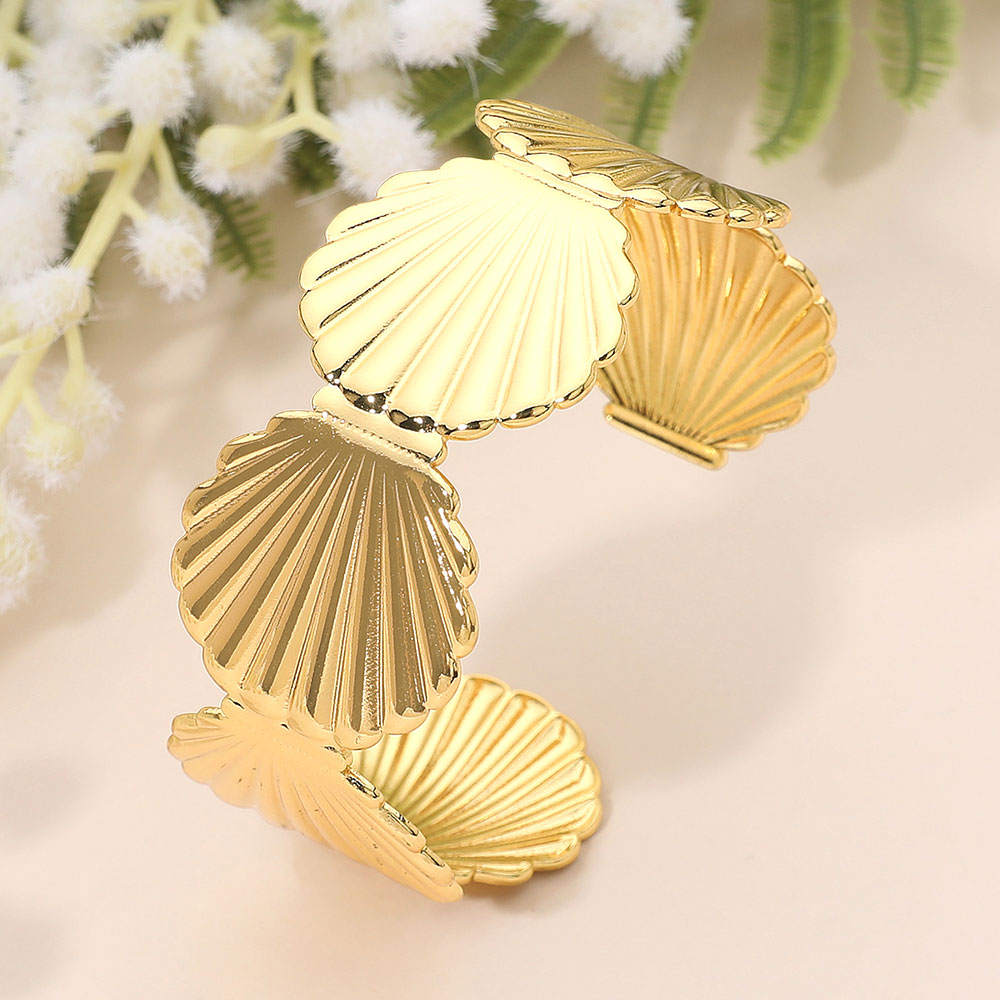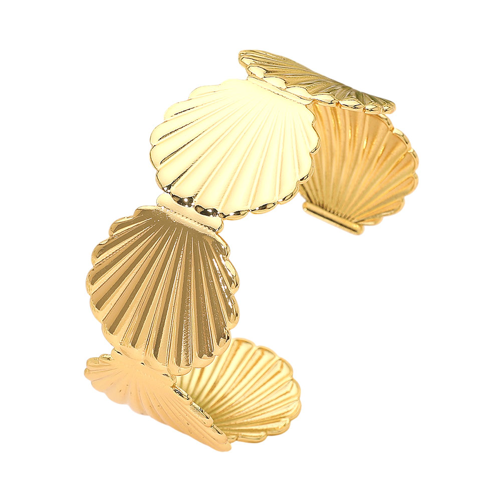 Details • Size : 1" H • Cuff / Adjustable • Water Resistant • Sculptural cuff bracelet inspired by layered seashell forms for a bold coastal statement. Designed to add elegant texture and eye-catching dimension to everyday outfits or resort-ready looks, this standout bracelet is perfect worn solo or stacked for effortless seaside style. • Hypoallergenic • Stainless Steel