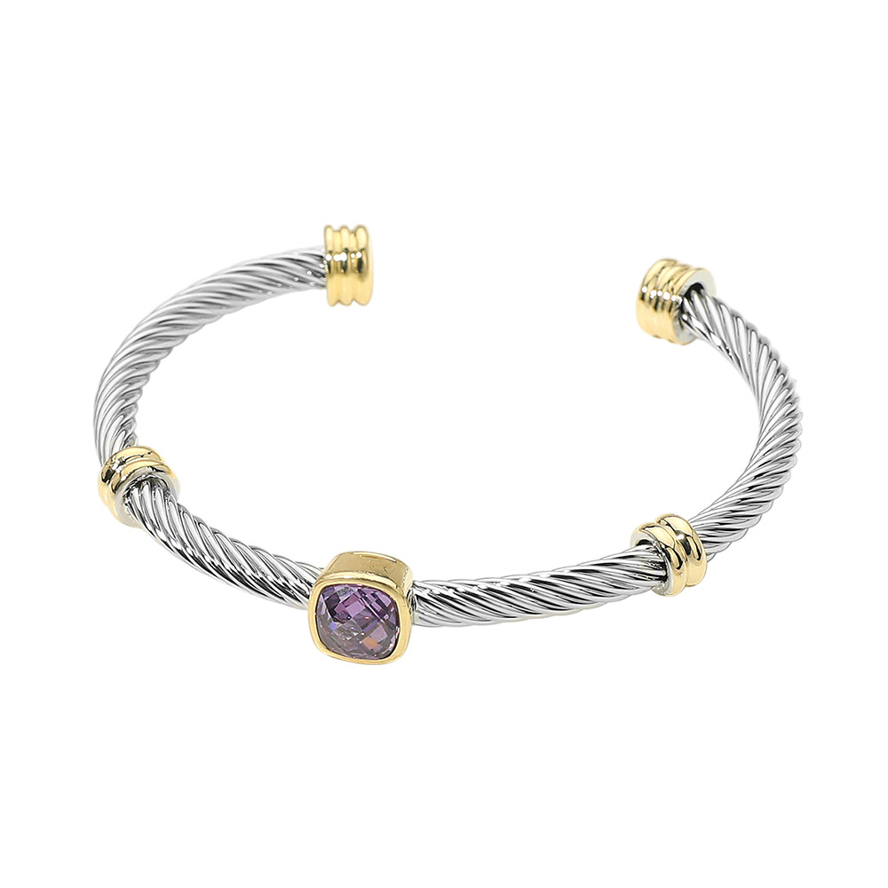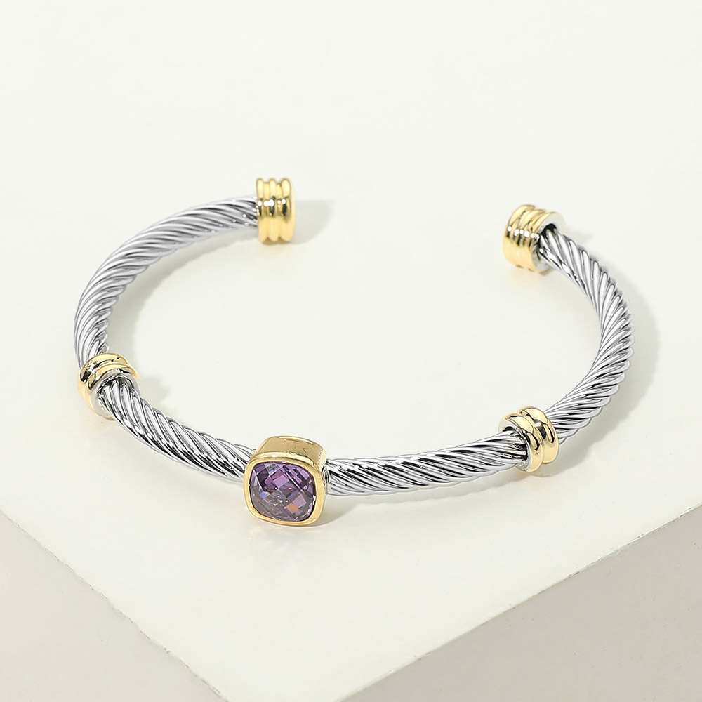 Square CZ Bezel Accent Two Tone Twisted Cable Cuff Bracelet