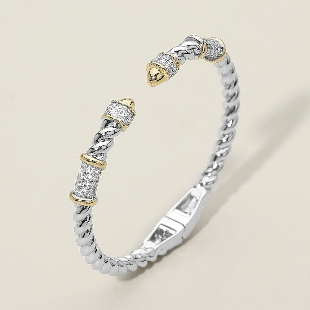 Details • Size : 0.25" H, 2.4: D • Hinged Closure / Cuff • Sophisticated open cuff bracelet featuring a braided band with crystal accent stations and polished end details. Designed for refined styling, this statement piece adds elegant sparkle while remaining versatile for everyday wear, special occasions, and effortless bracelet layering. • CZ Cubic Zirconia