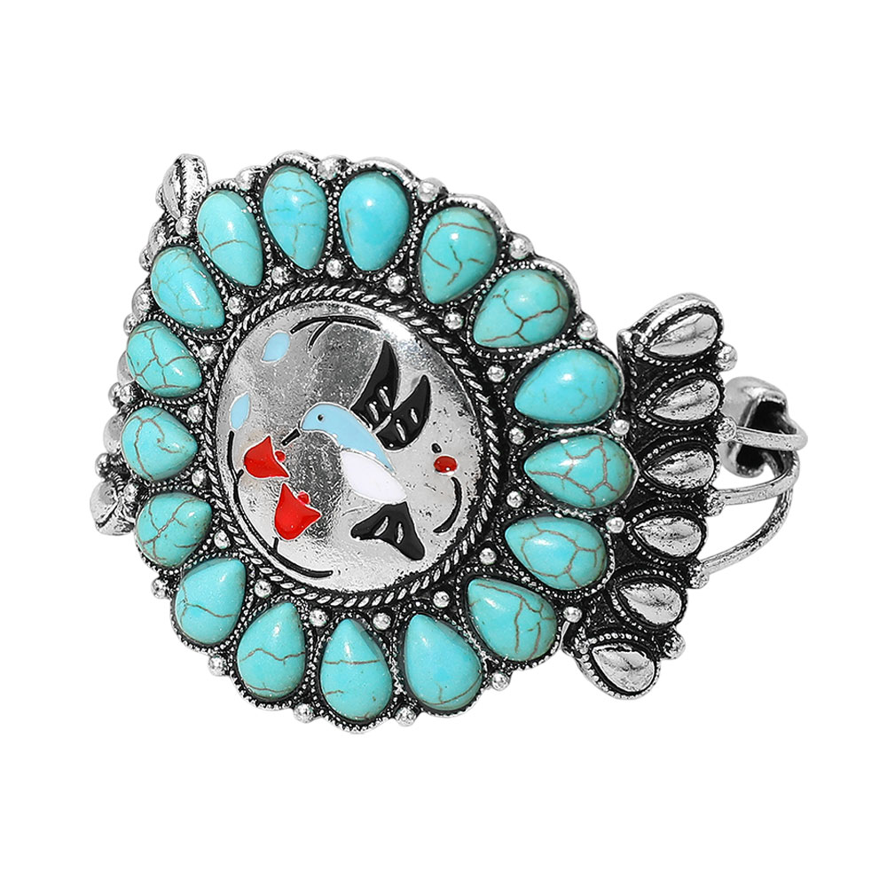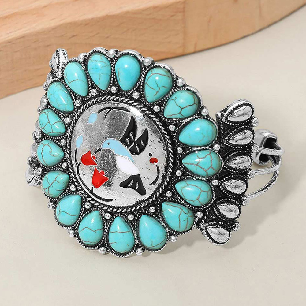• Make a bold statement with this western-inspired hummingbird cuff bracelet featuring an ornate center scene framed by faceted teardrop accents. The adjustable open design sits comfortably on the wrist, adding radiant sparkle and artistic flair to casual outfits, festivals, or special events.