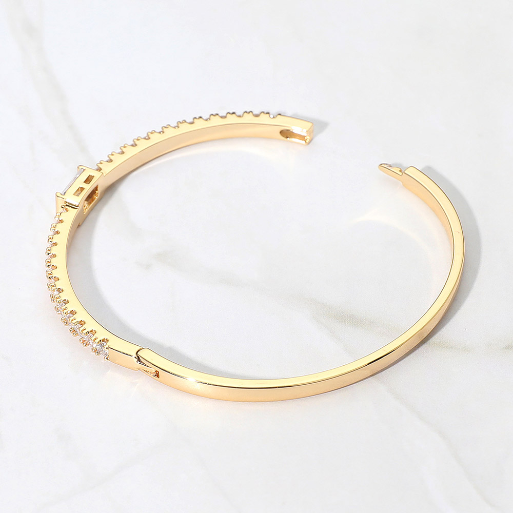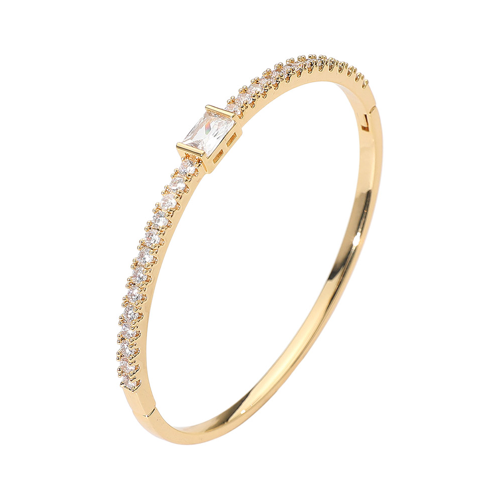 Details • Size : 0.25" H, 2.25" D • Hinged Closure • Add refined sparkle to your look with this rectangular crystal bangle bracelet featuring a sleek, minimalist design. Perfect for layering or wearing solo, it offers timeless sophistication and modern elegance, making it ideal for both casual and formal occasions. • Gold Dipped