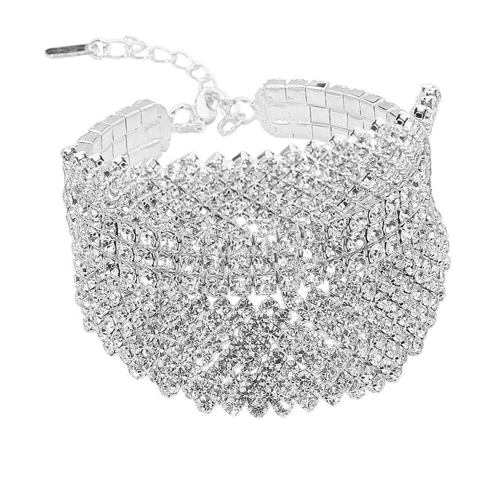 • Add refined sparkle to your look with this layered crystal evening bracelet. Designed with multiple rows of luminous stones that catch every glimmer of light, it exudes timeless sophistication. The adjustable clasp ensures comfort, making it perfect for formal events or chic nights out.