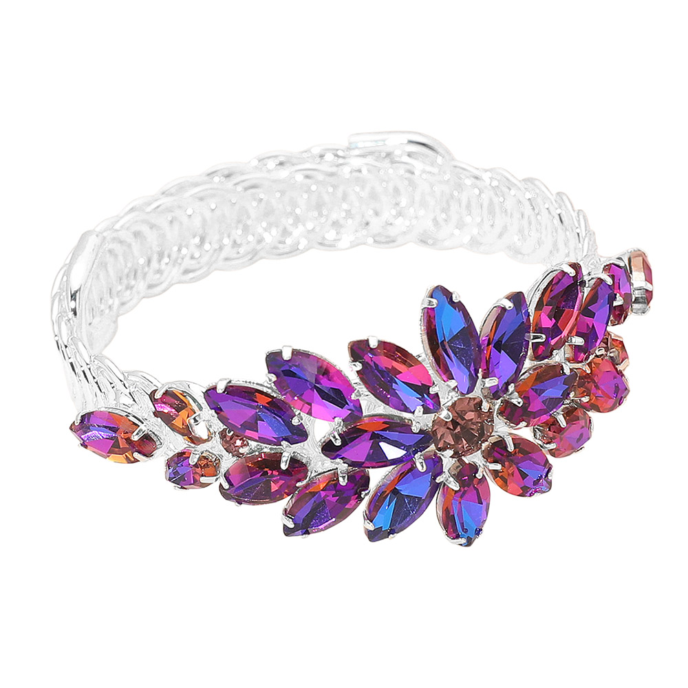 • Shine with elegance in this floral rhinestone stretch bracelet. Designed with dazzling marquise-cut stones arranged in a radiant flower motif, it adds a glamorous sparkle to any look. The flexible band ensures a comfortable fit, making it the perfect accessory for both casual and formal wear.