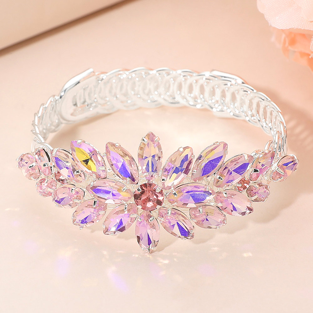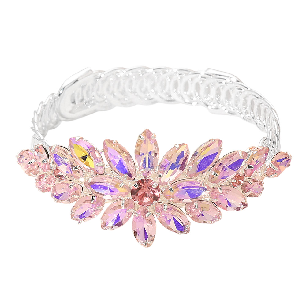 • Shine with elegance in this floral rhinestone stretch bracelet. Designed with dazzling marquise-cut stones arranged in a radiant flower motif, it adds a glamorous sparkle to any look. The flexible band ensures a comfortable fit, making it the perfect accessory for both casual and formal wear.