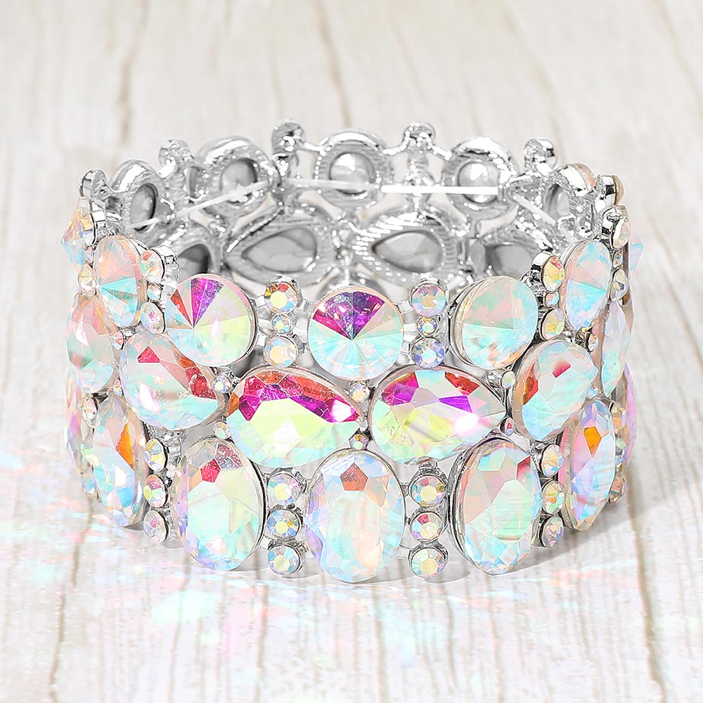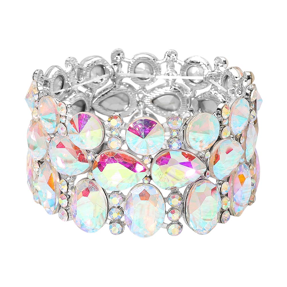 Details • Size : 1.6" H, 2.5" D • Stretchable • This elegant gemstone statement bracelet dazzles with a stunning mix of oval and round-cut stones arranged in an intricate pattern. Designed to catch the light from every angle, it adds sophistication and glamour to any ensemble—perfect for special occasions or evening wear. • Lead and Nickel Compliant