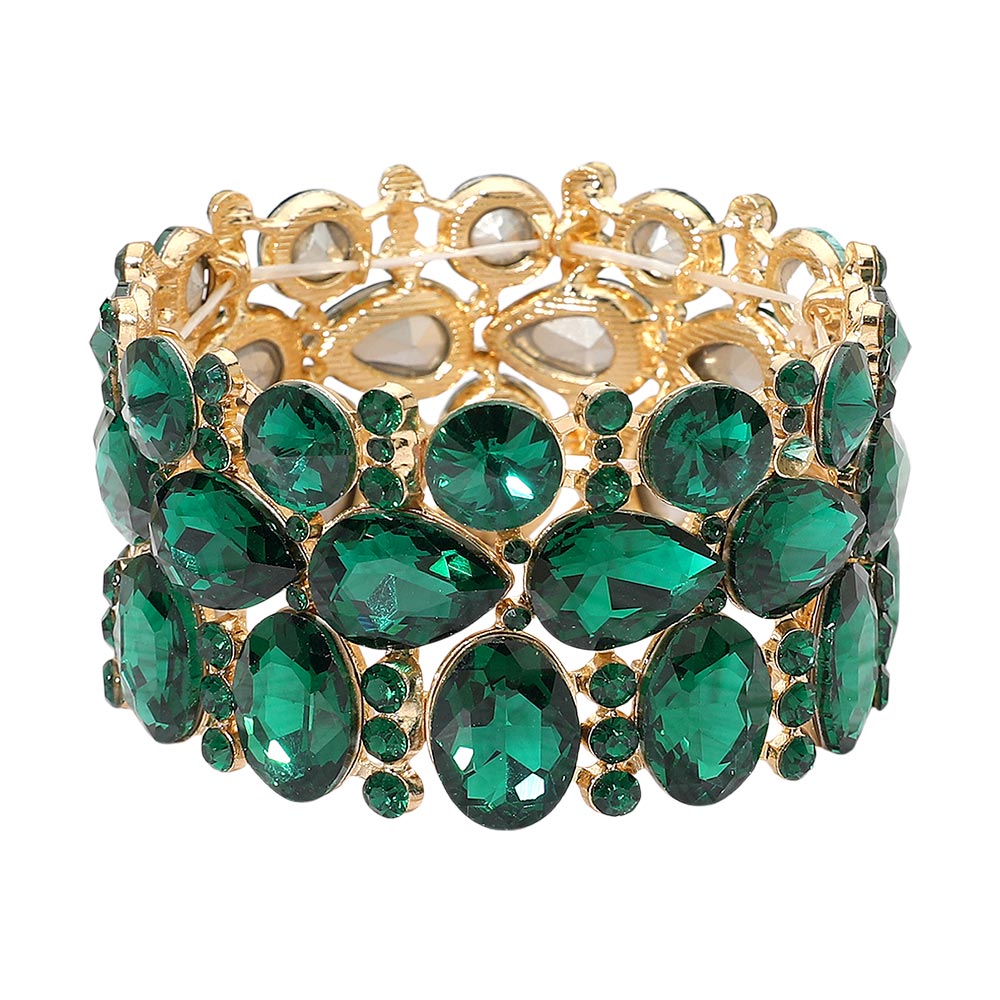 Details • Size : 1.6" H, 2.5" D • Stretchable • This elegant gemstone statement bracelet dazzles with a stunning mix of oval and round-cut stones arranged in an intricate pattern. Designed to catch the light from every angle, it adds sophistication and glamour to any ensemble—perfect for special occasions or evening wear. • Lead and Nickel Compliant