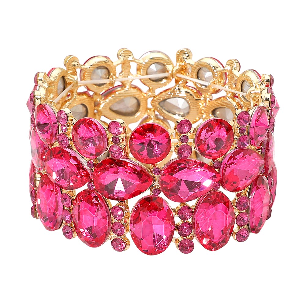 Details • Size : 1.6" H, 2.5" D • Stretchable • This elegant gemstone statement bracelet dazzles with a stunning mix of oval and round-cut stones arranged in an intricate pattern. Designed to catch the light from every angle, it adds sophistication and glamour to any ensemble—perfect for special occasions or evening wear. • Lead and Nickel Compliant