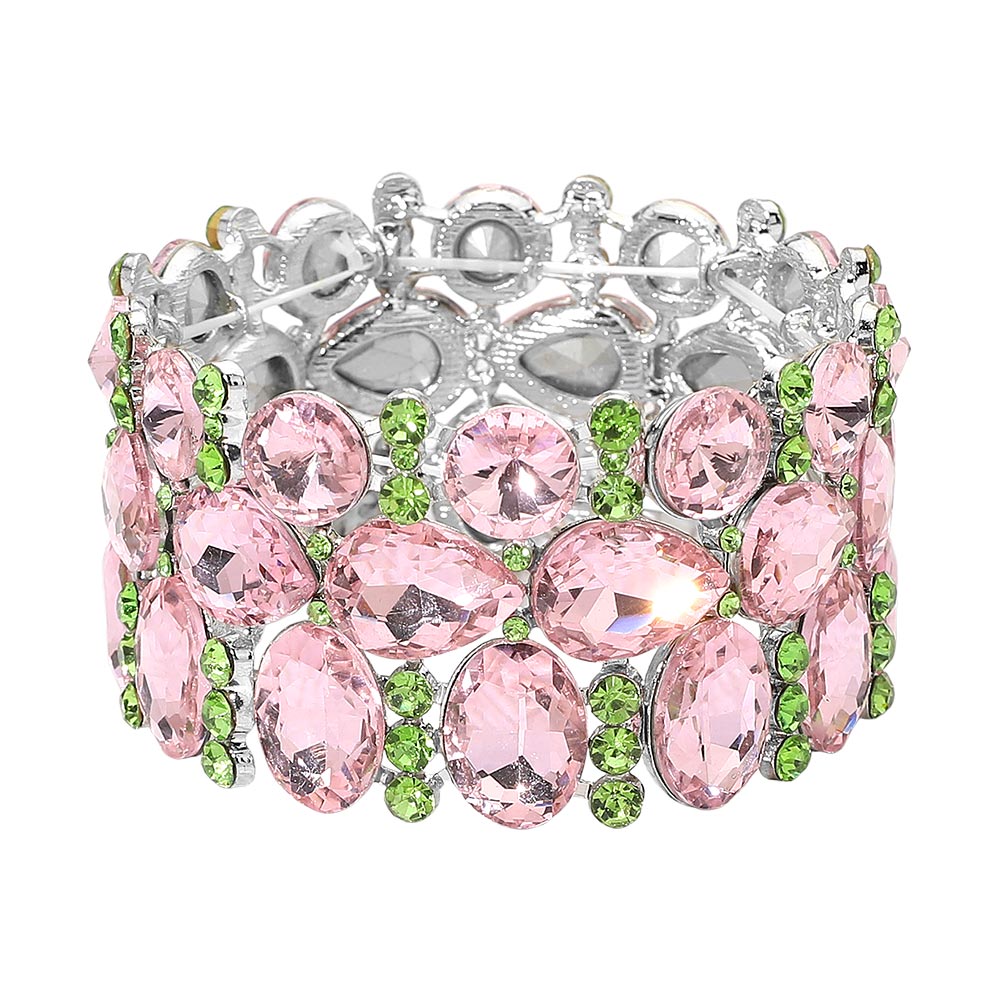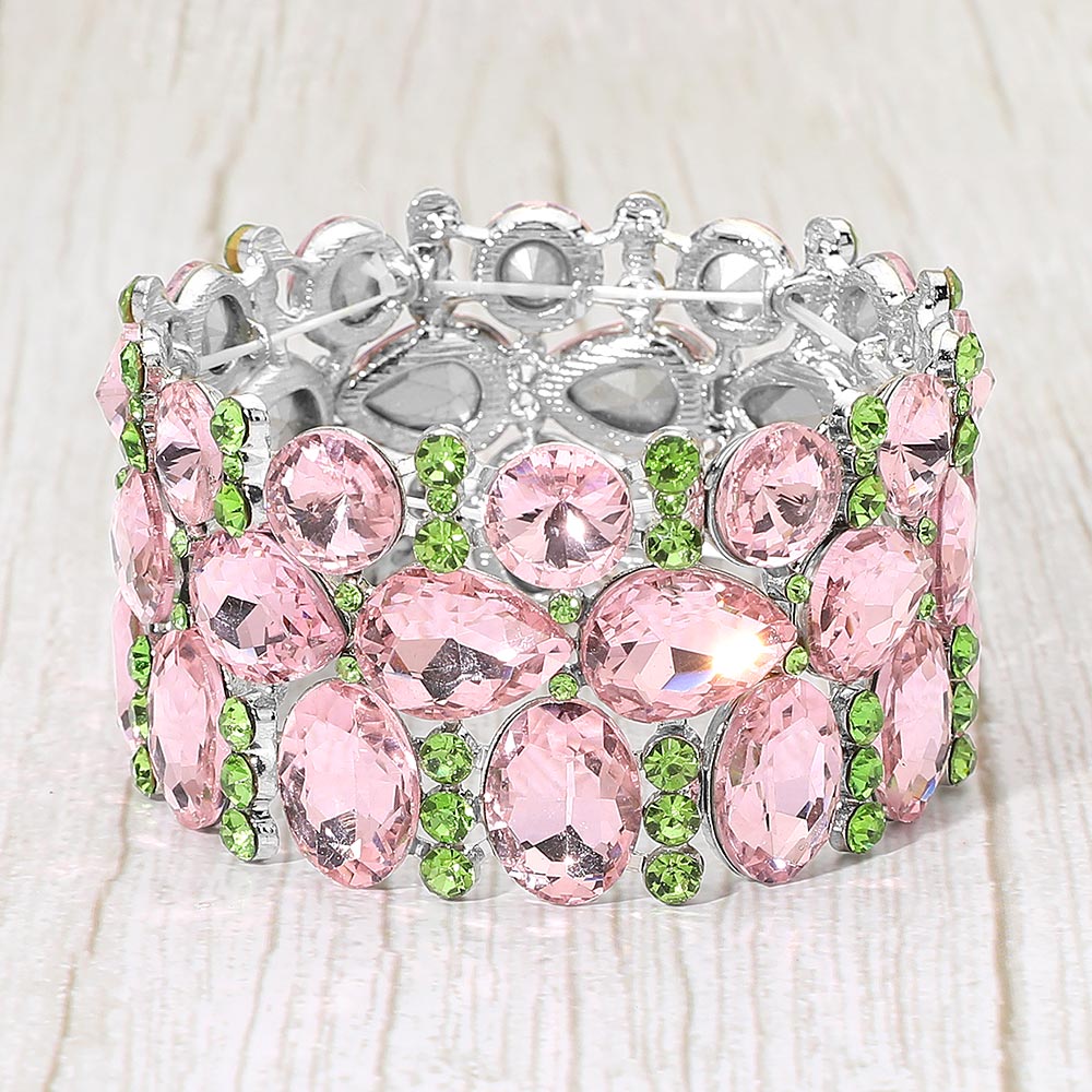 Details • Size : 1.6" H, 2.5" D • Stretchable • This elegant gemstone statement bracelet dazzles with a stunning mix of oval and round-cut stones arranged in an intricate pattern. Designed to catch the light from every angle, it adds sophistication and glamour to any ensemble—perfect for special occasions or evening wear. • Lead and Nickel Compliant