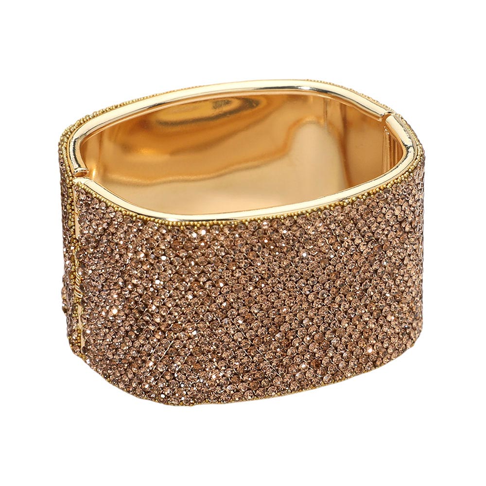 • Statement bangle bracelet featuring a bold, wide silhouette with a smooth interior and secure hinge closure. Designed to elevate evening looks, bridal styling, and special occasions, this bracelet delivers high-impact shine and a polished finish for confident, standout accessorizing.