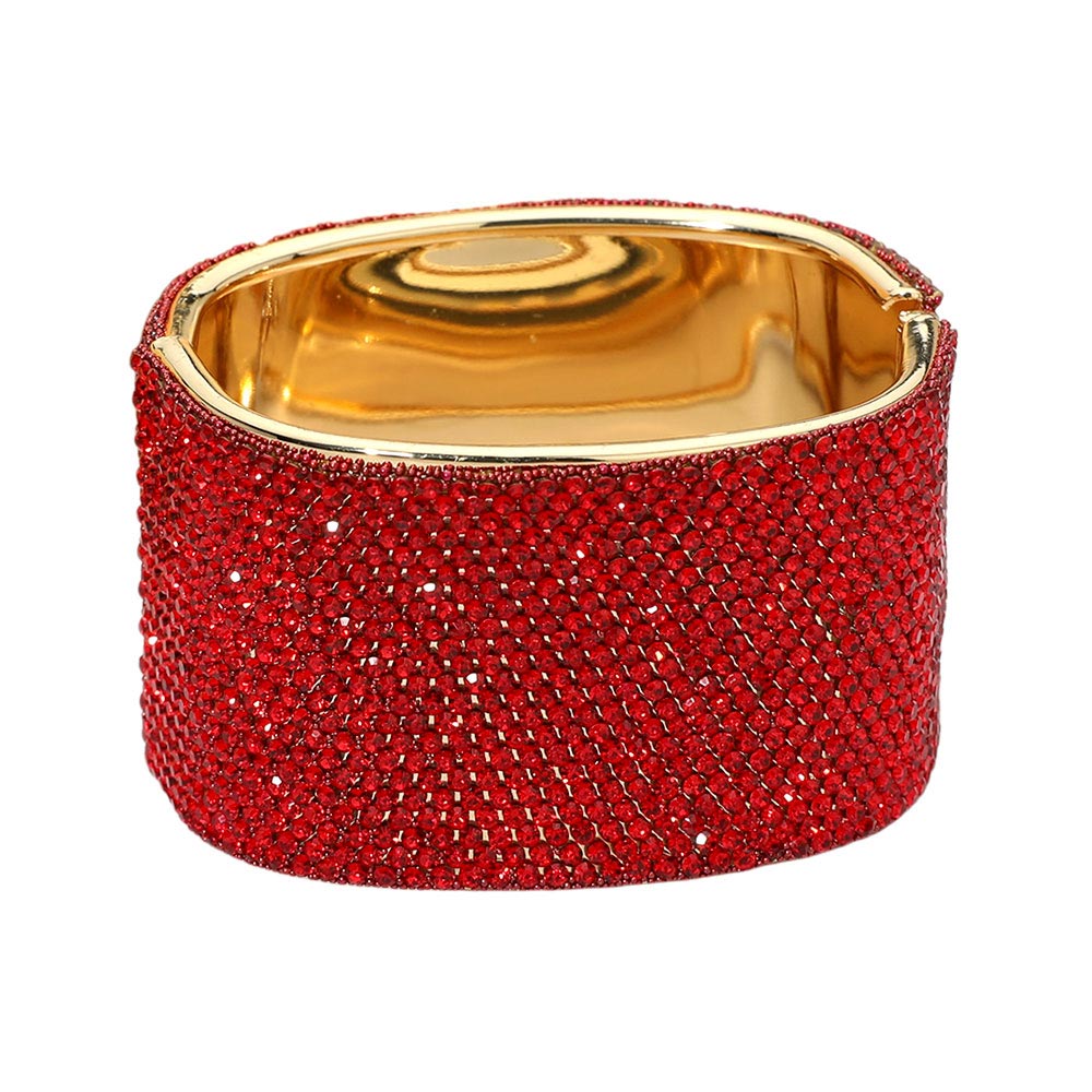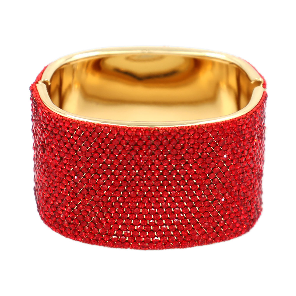 • Statement bangle bracelet featuring a bold, wide silhouette with a smooth interior and secure hinge closure. Designed to elevate evening looks, bridal styling, and special occasions, this bracelet delivers high-impact shine and a polished finish for confident, standout accessorizing.