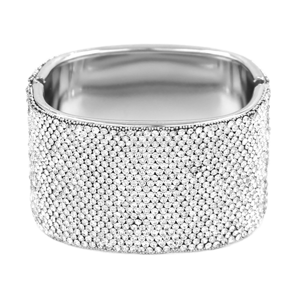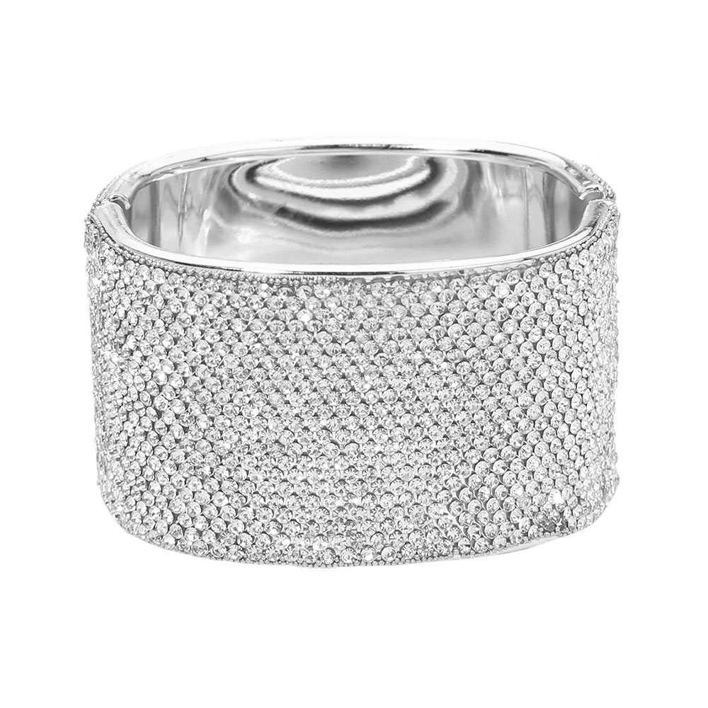 • Statement bangle bracelet featuring a bold, wide silhouette with a smooth interior and secure hinge closure. Designed to elevate evening looks, bridal styling, and special occasions, this bracelet delivers high-impact shine and a polished finish for confident, standout accessorizing.