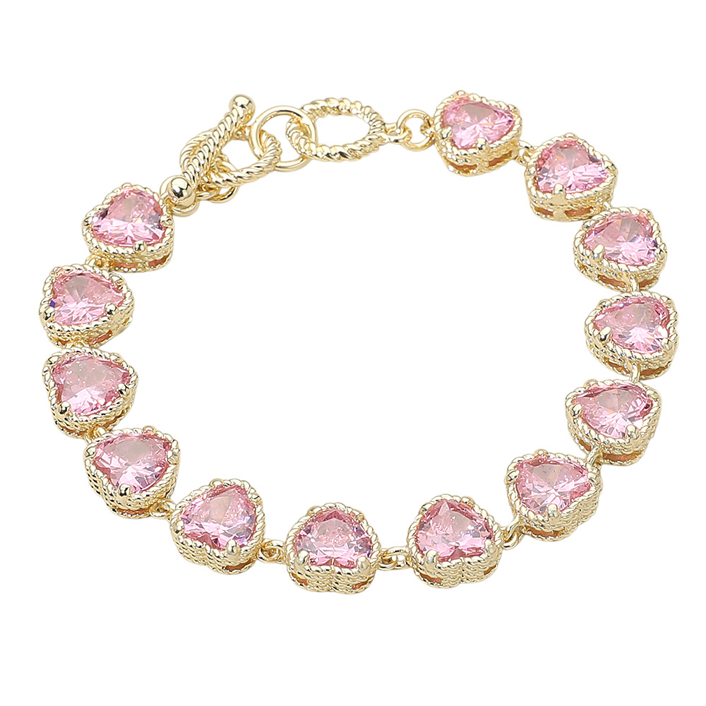 Details • Size : 0.3" H, 7" + 1" L • Toggle Closure • Showcase timeless romance with this bracelet featuring sparkling pink heart-cut crystals in a delicate linked setting. Its refined design captures light beautifully, making it the perfect accessory for adding elegance and charm to everyday wear or special celebrations. • CZ Cubic Zirconia • Gold Dipped