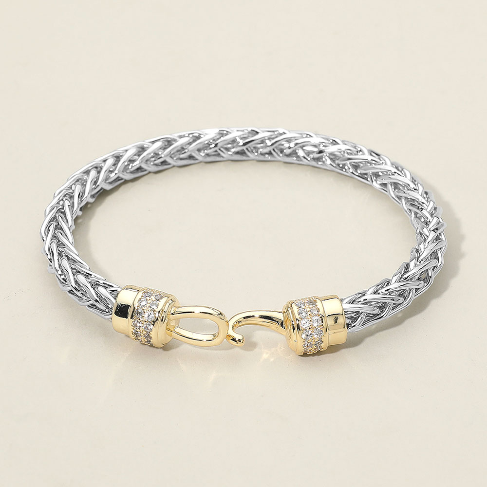 Details • Size : 0.4" H, 2.7" D • Hook Closure • A sleek woven bracelet designed with a refined braided structure and finished with a polished clasp accented in shimmering detail. Its modern, understated elegance makes it perfect for elevating everyday style or complementing dressier looks with subtle sophistication. • CZ Cubic Zirconia • Gold Dipped