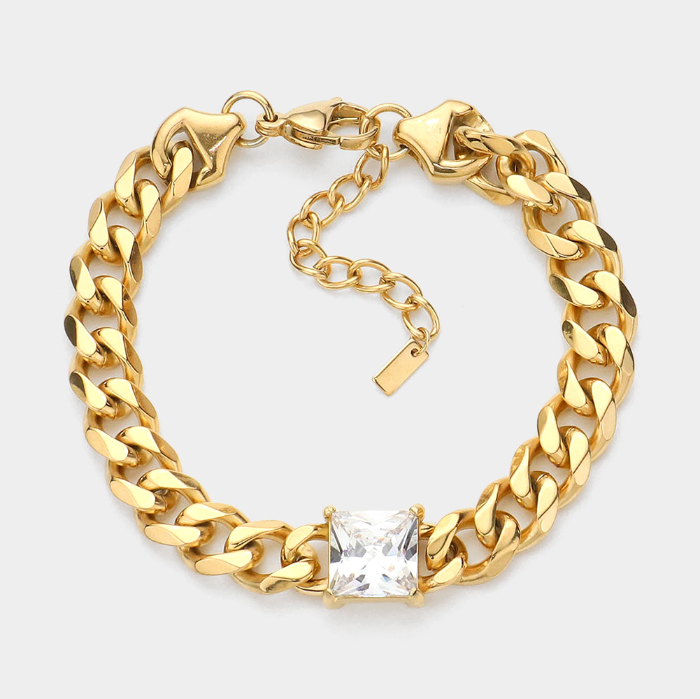 18K Gold Dipped Stainless Steel CZ Square Stone Accented Chain Link Bracelet