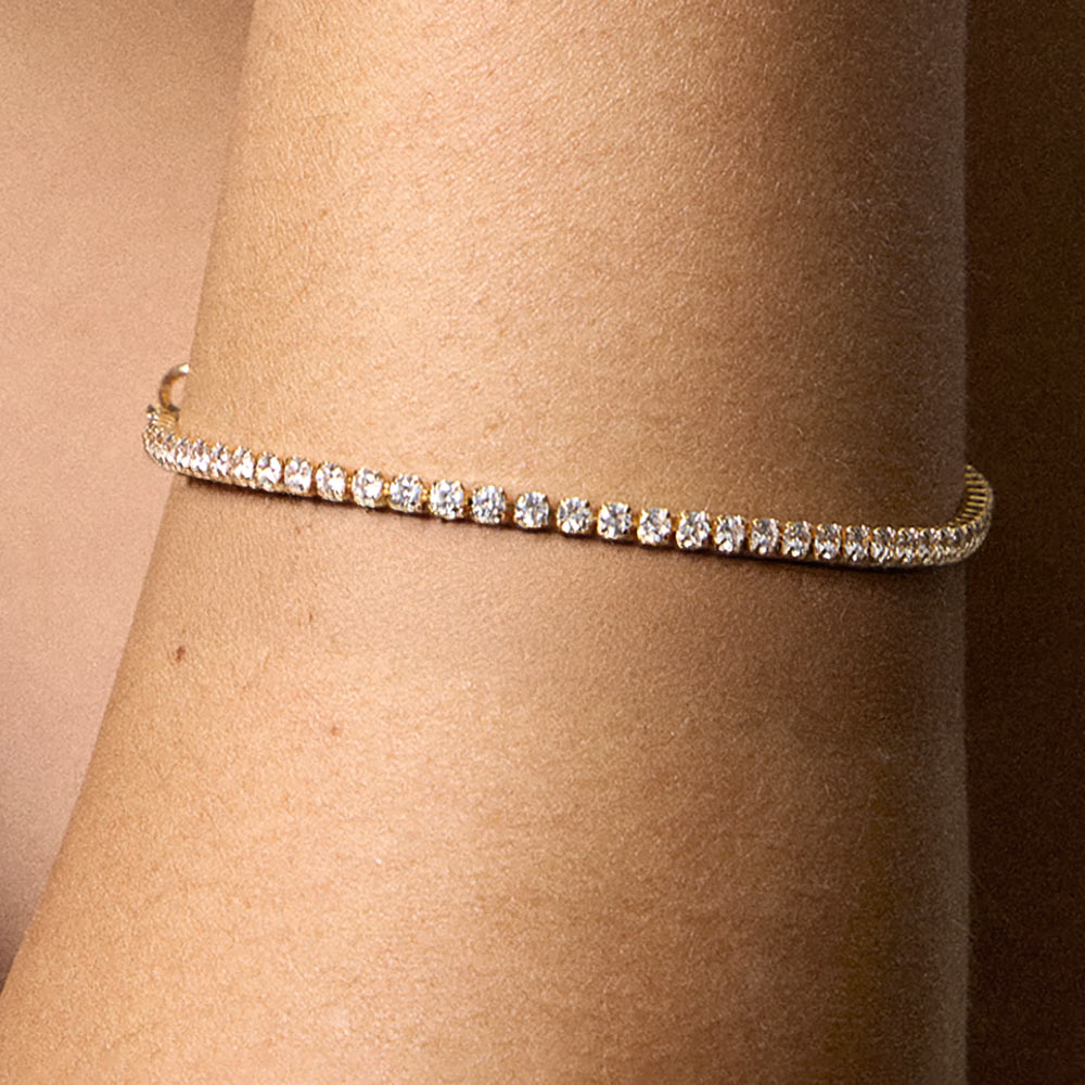 Details • Size : 0.1" H, 7" + 1.75" L • Lobster Clasp Closure • This classic tennis chain bracelet delivers timeless elegance with a clean, refined silhouette. Designed with an adjustable extension for a comfortable fit, it’s ideal for stacking or wearing solo. A versatile jewelry essential perfect for everyday styling, special occasions, gifting, and curated retail collections. • CZ Cubic Zirconia • Gold Filled • Hypoallergenic • Lead and Nickel Compliant • Made In Brazil