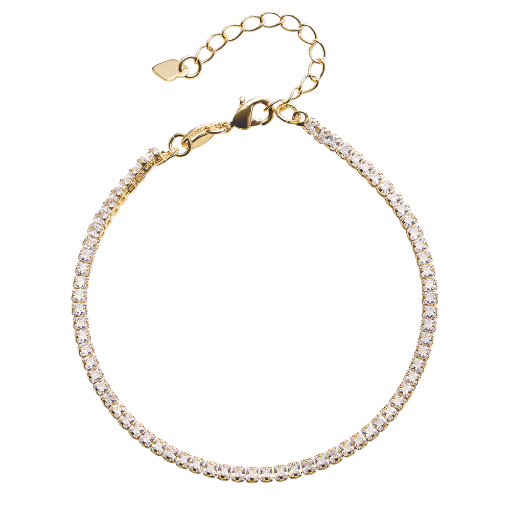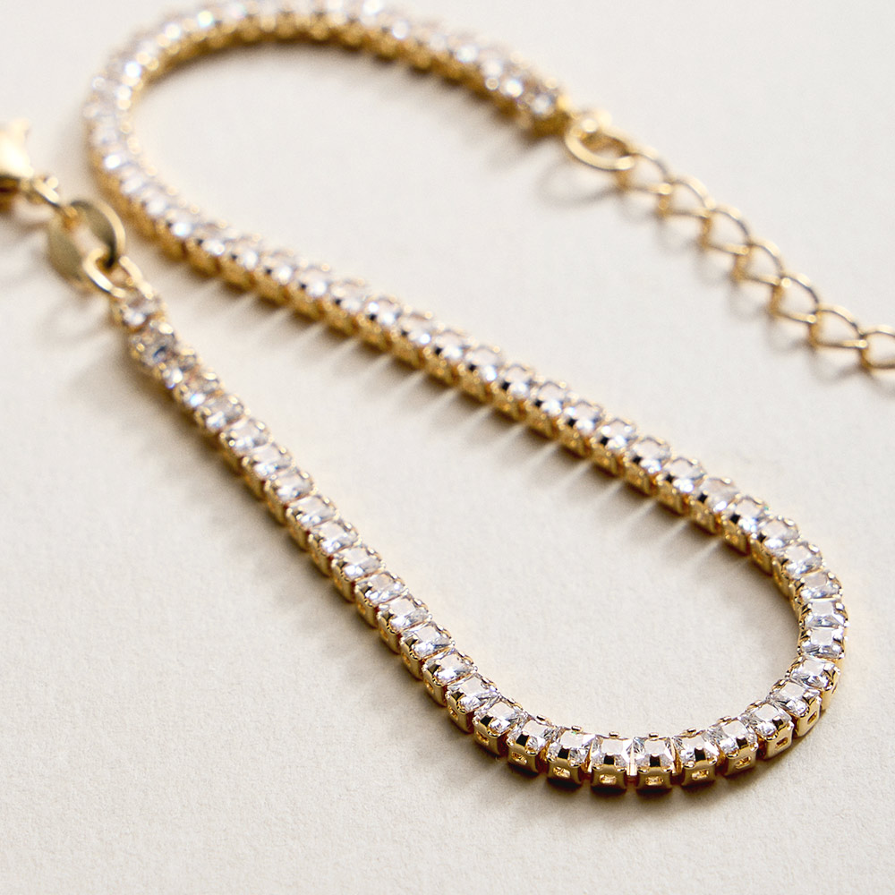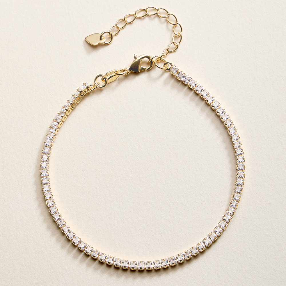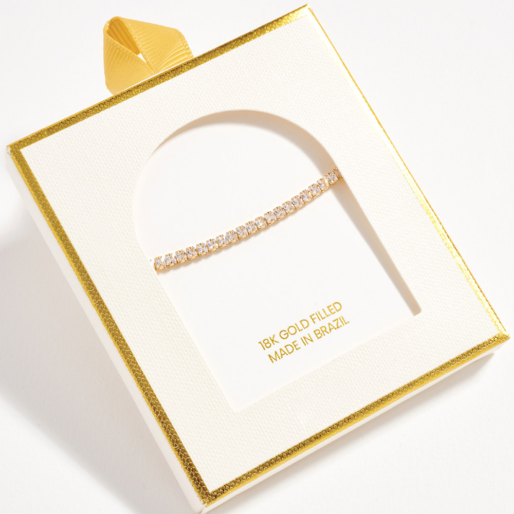 Details • Size : 0.1" H, 7" + 1.75" L • Lobster Clasp Closure • This classic tennis chain bracelet offers a timeless, elegant look with a sleek, refined design. Finished with an adjustable extension for a comfortable fit, it’s perfect worn alone or layered with other bracelets. A versatile jewelry staple ideal for everyday wear, gifting, and curated boutique collections. • CZ Cubic Zirconia • Gold Filled • Hypoallergenic • Lead and Nickel Compliant • Made In Brazil