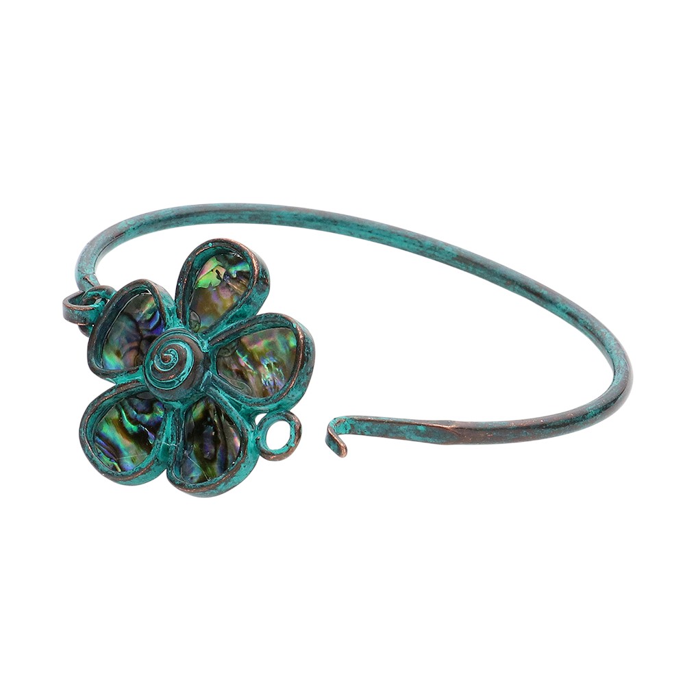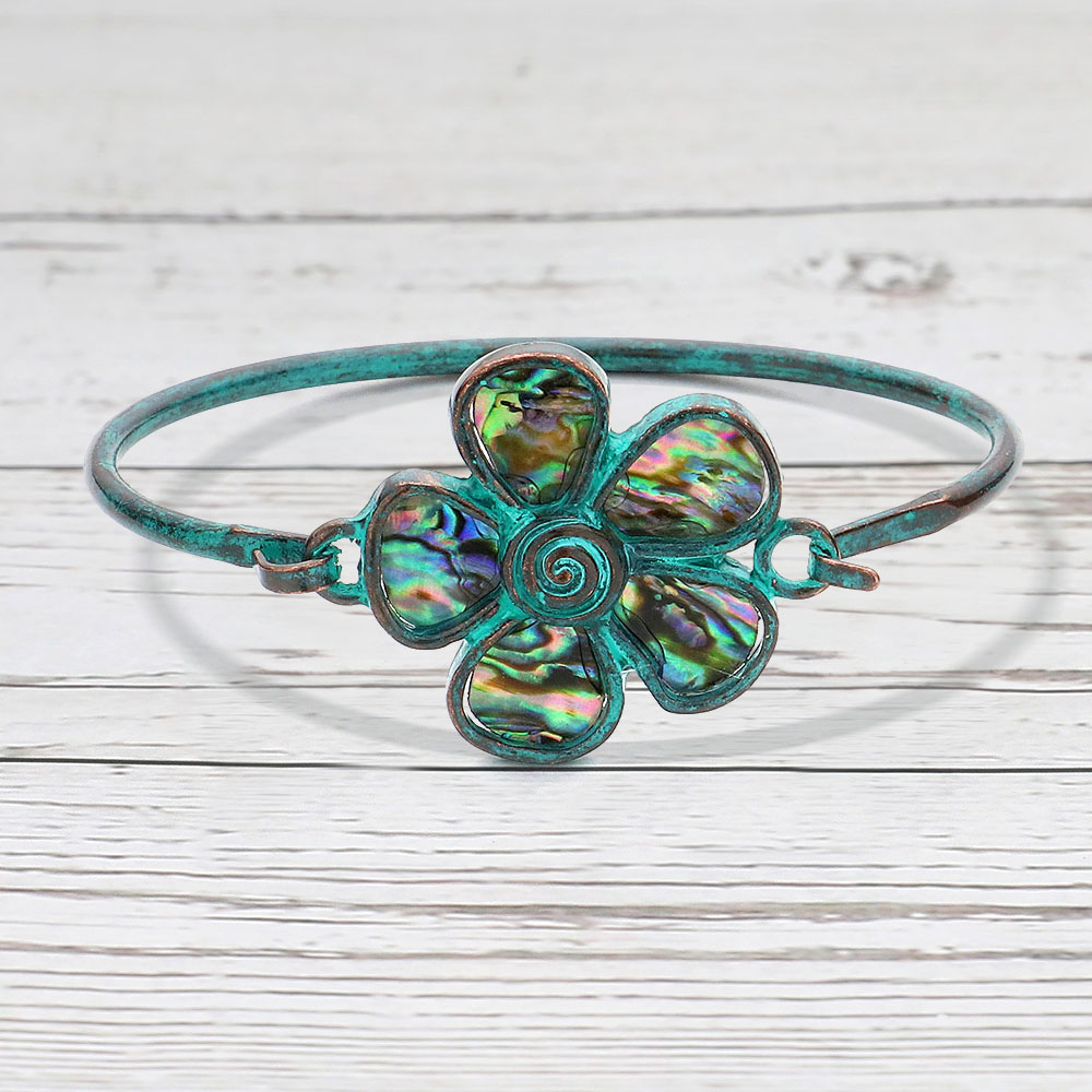 Details • Size : 1.1" H, 2.3" D • Hook Closure • Embrace natural elegance with this abalone flower spiral bangle bracelet. Featuring iridescent floral petals with a central spiral accent, this piece combines artistic charm with a touch of oceanic beauty. Perfect for adding color and sophistication to your everyday or evening style. • Lead and Nickel Compliant