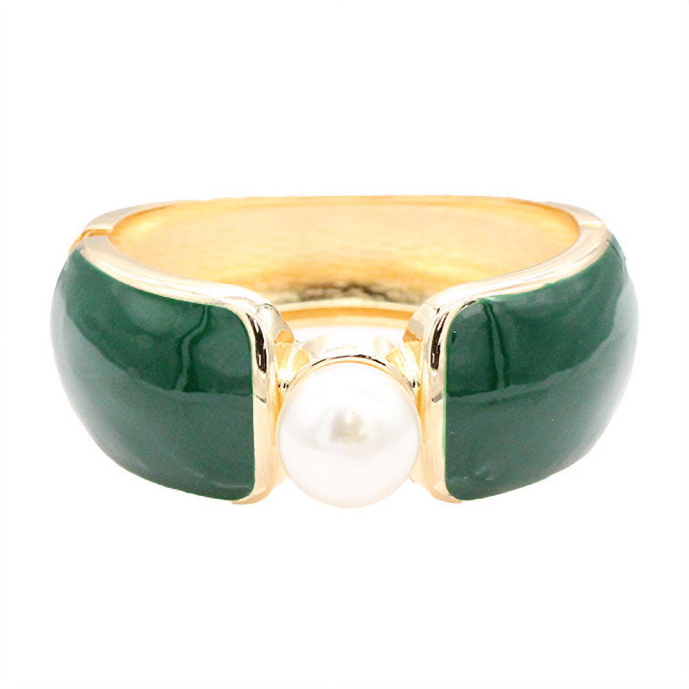 Bold Central Pearl Accent Wide Enamel Hinged Bangle Bracelet