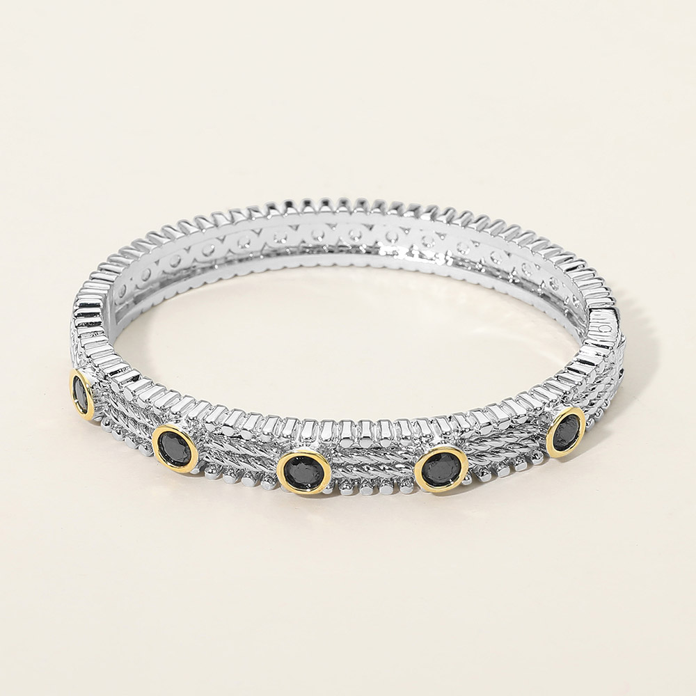 • This statement hinged bangle bracelet features a detailed textured band accented with evenly spaced bezel-style elements for a refined, modern look. Designed for comfortable slip-on wear, it adds structure and visual interest to both casual and dressy outfits, making it a versatile addition for curated jewelry collections or gift-ready displays.
