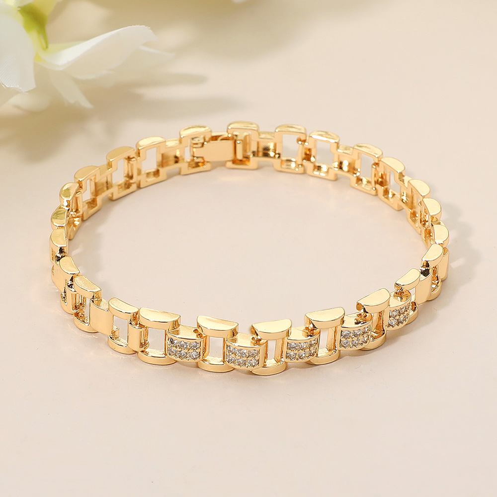 Details • Size : 0.3" H, 7.25" + 0.3" L • Fold Over Closure • Sophisticated link bracelet featuring a polished chain design accented with sparkling details. Perfect for both casual and formal wear, this versatile accessory adds timeless elegance to any outfit. Lightweight and stylish, it’s an ideal piece for everyday sophistication or gifting. • Brass • CZ Cubic Zirconia • Lead and Nickel Compliant