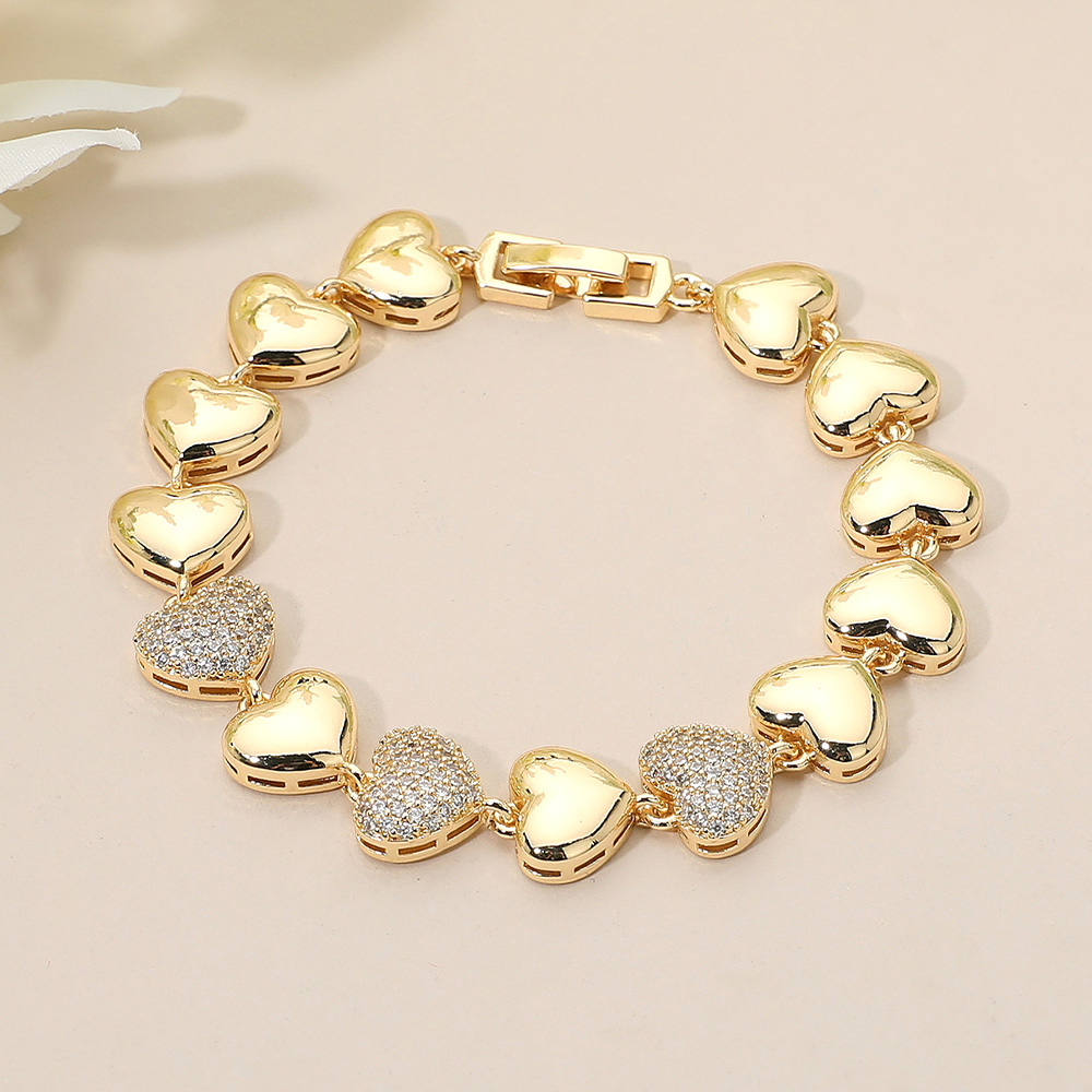 Details • Size : 0.4" H, 7.25" + 0.3" L • Fold Over Closure • Charming heart link bracelet featuring polished heart shapes accented with sparkling details. Perfect for adding a touch of romance to everyday or dressy outfits, this bracelet is lightweight and elegant. A beautiful accessory ideal for gifting or enhancing your jewelry collection with timeless love-inspired style. • Brass • CZ Cubic Zirconia • Lead and Nickel Compliant