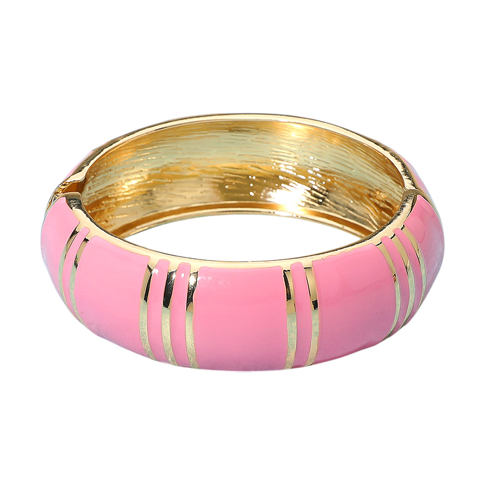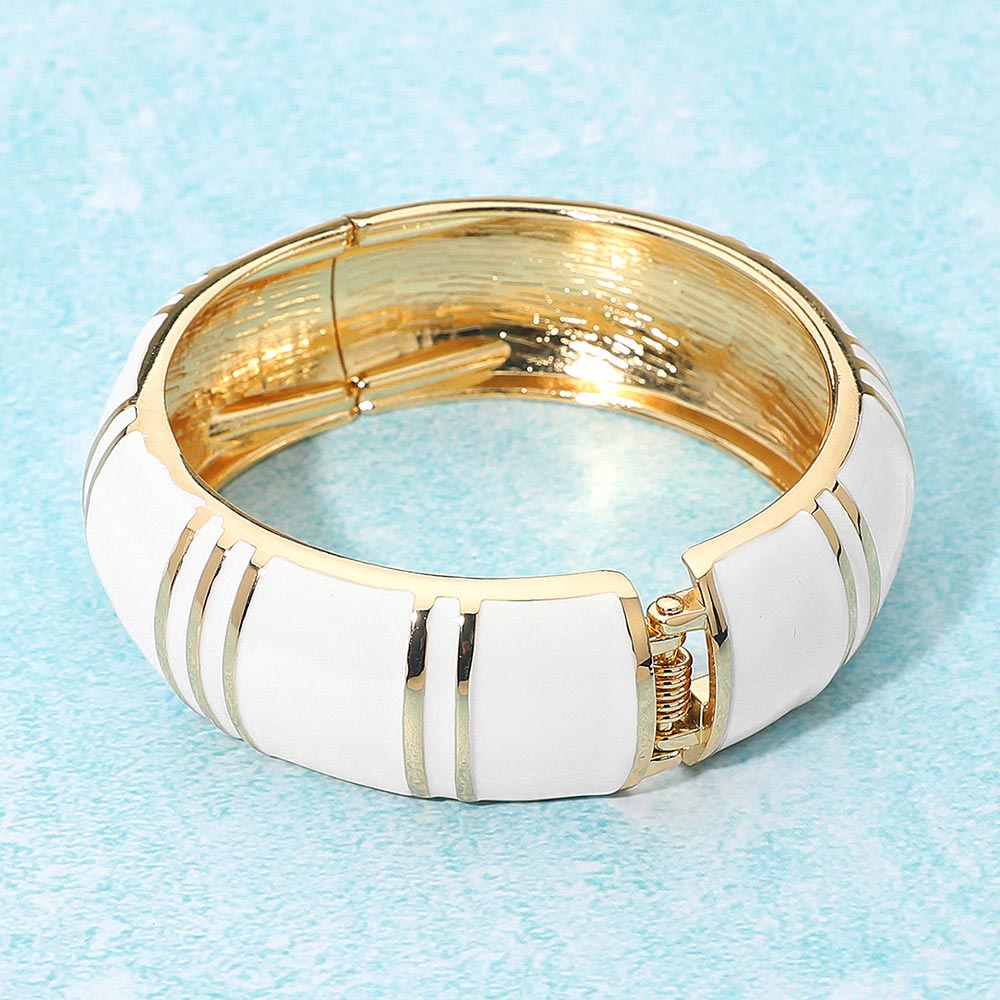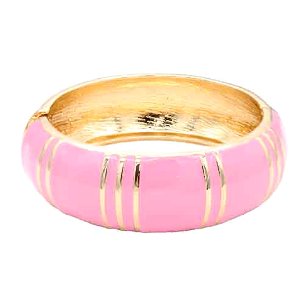 Details • Size : 0.9" H, 2.5" D • Hinged Closure • Chic dome-shaped bracelet featuring sleek striped accents and a smooth polished finish. Designed with a secure hinged closure for comfort and ease, this bold fashion accessory adds modern sophistication and a refined touch to any outfit or occasion. • Lead and Nickel Compliant