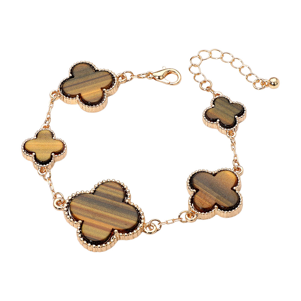 • Chic bracelet featuring five quatrefoil-shaped charms linked along a sleek gold chain. With a mix of small and large motifs, it adds elegance and versatility to any outfit. Perfect for layering or wearing solo, this timeless accessory complements both casual and formal looks effortlessly.