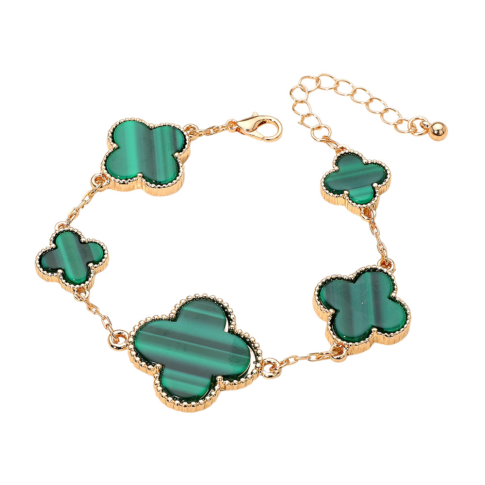 • Chic bracelet featuring five quatrefoil-shaped charms linked along a sleek gold chain. With a mix of small and large motifs, it adds elegance and versatility to any outfit. Perfect for layering or wearing solo, this timeless accessory complements both casual and formal looks effortlessly.