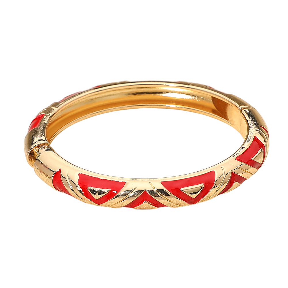 • Chic geometric hinged bangle bracelet featuring sleek enamel inlay and a polished metallic finish. Its modern pattern adds a stylish accent to any outfit, perfect for layering or wearing alone for an elegant statement. Ideal for both everyday wear and sophisticated occasions.
