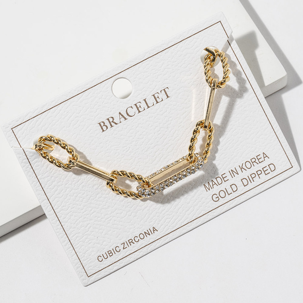 • Statement link bracelet featuring twisted chain details and a sleek bar accent with sparkling cubic zirconia. Designed for everyday wear or special occasions, this bracelet adds a refined, modern touch to layered looks and makes a versatile choice for boutique and gift collections.