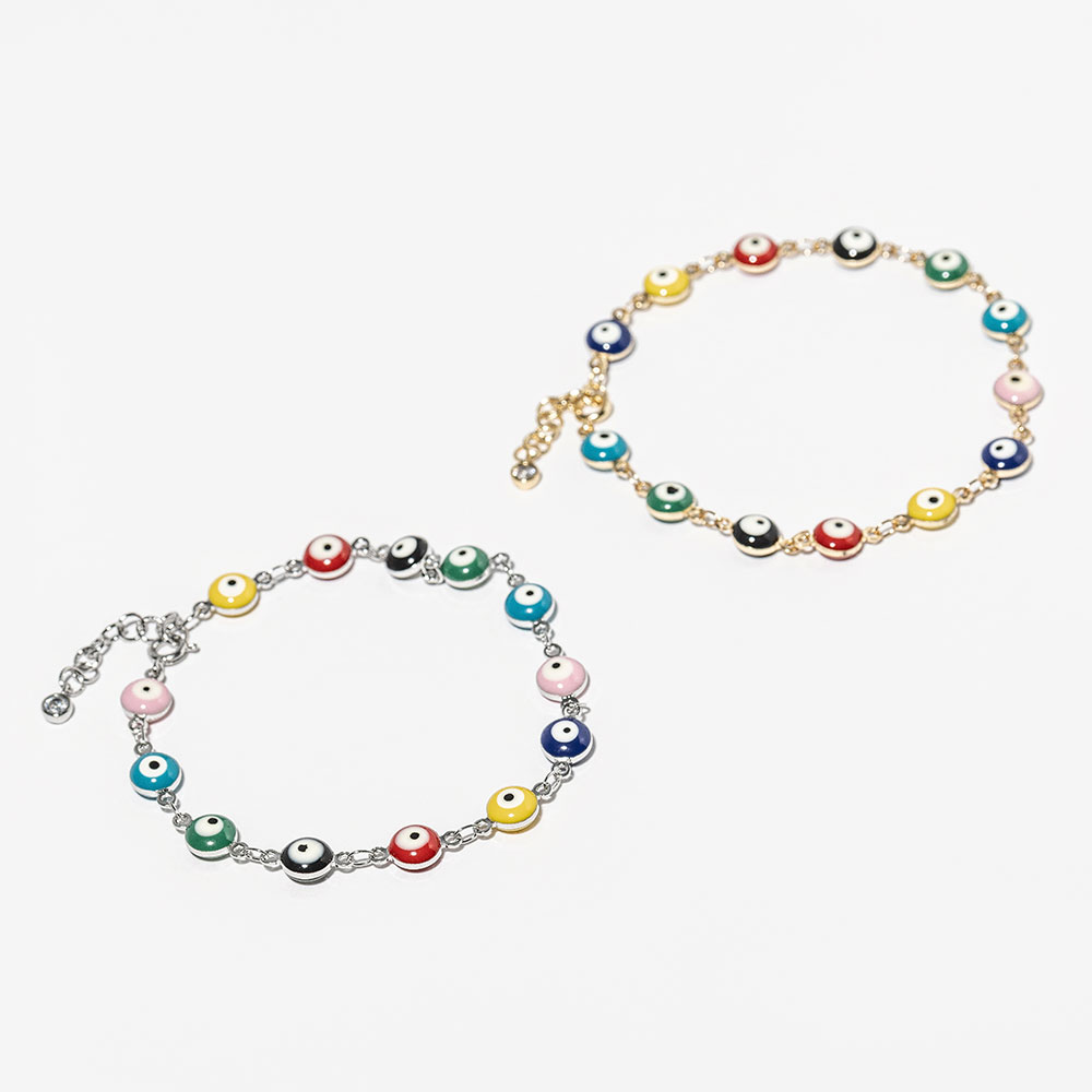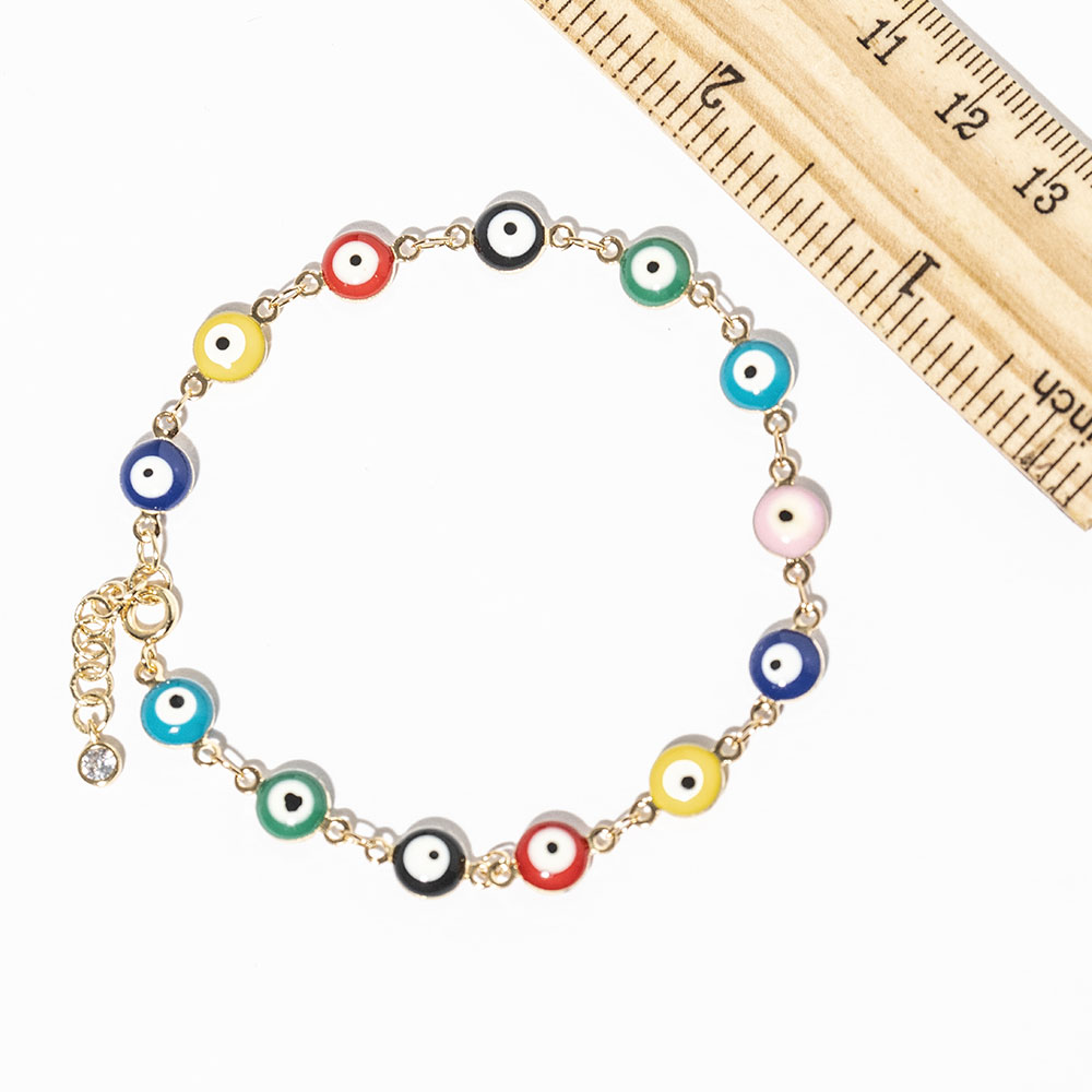 Details • Size : 0.25" H, 7.25" + 1" L • Lobster Clasp Closure • Playful evil eye link bracelet designed with a series of round charms symbolizing protection and positivity. A chic, lightweight accessory that adds a touch of color and meaning to your look, perfect for layering or wearing solo as a trendy everyday good luck piece. • Gold Dipped • Lead and Nickel Compliant • Made In Korea