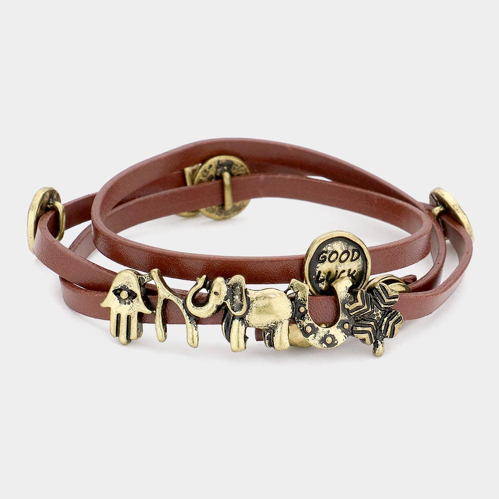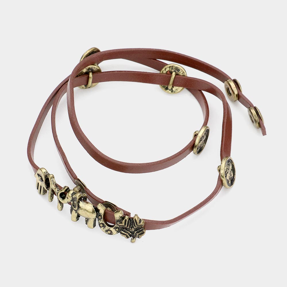 Message Disc Cluster Evil Eye Hamsa Hand & Elephant Faux Leather Wrap Bracelet