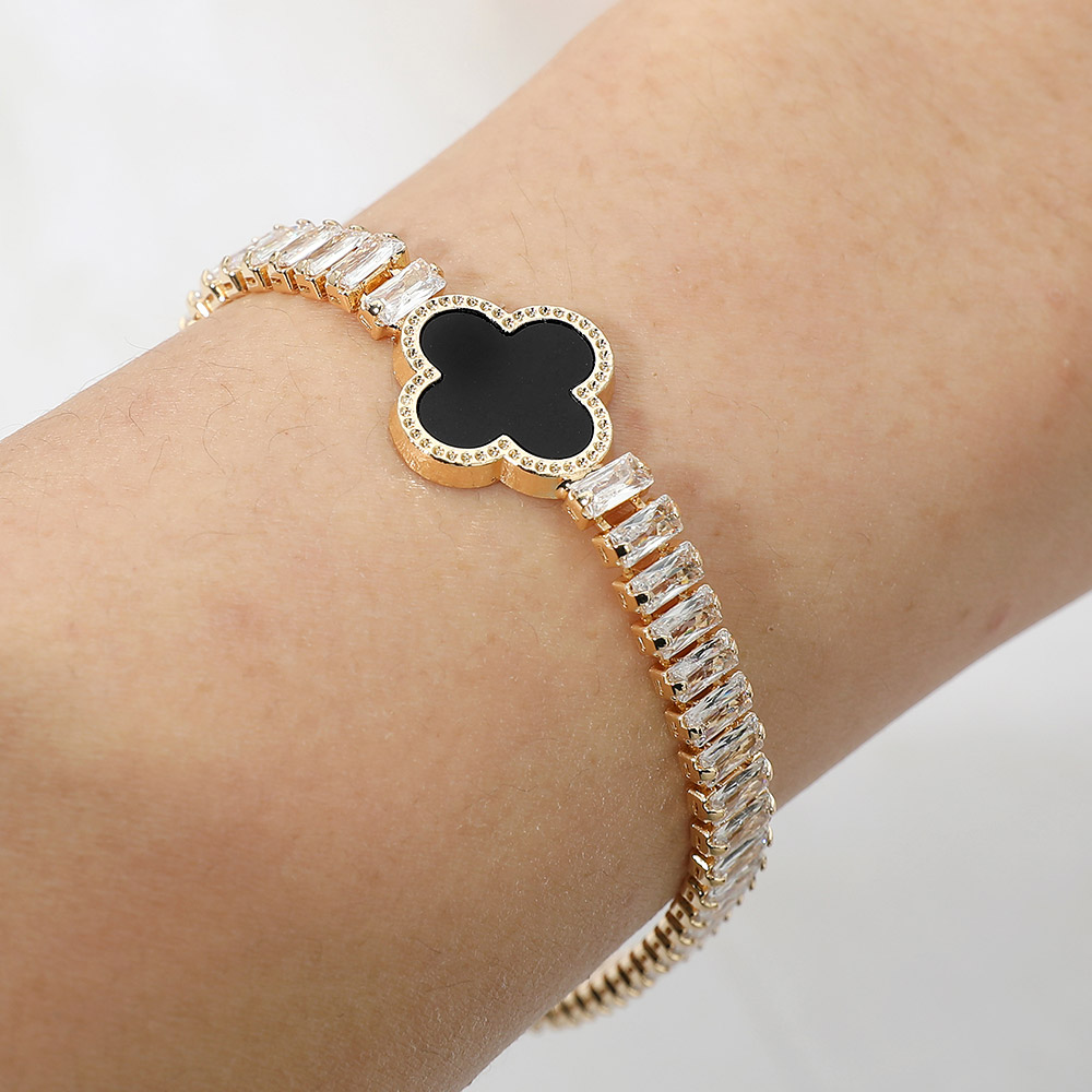 Details • Size : 0.6" H, 7.5" L • Fold Over Closure • Refined tennis style bracelet featuring a sleek quatrefoil accent that adds symbolic charm and elevated detail. Designed with a secure clasp for a polished fit, this piece is ideal for everyday elegance, special occasions, boutique assortments, and giftable jewelry collections. • Brass • CZ Cubic Zirconia