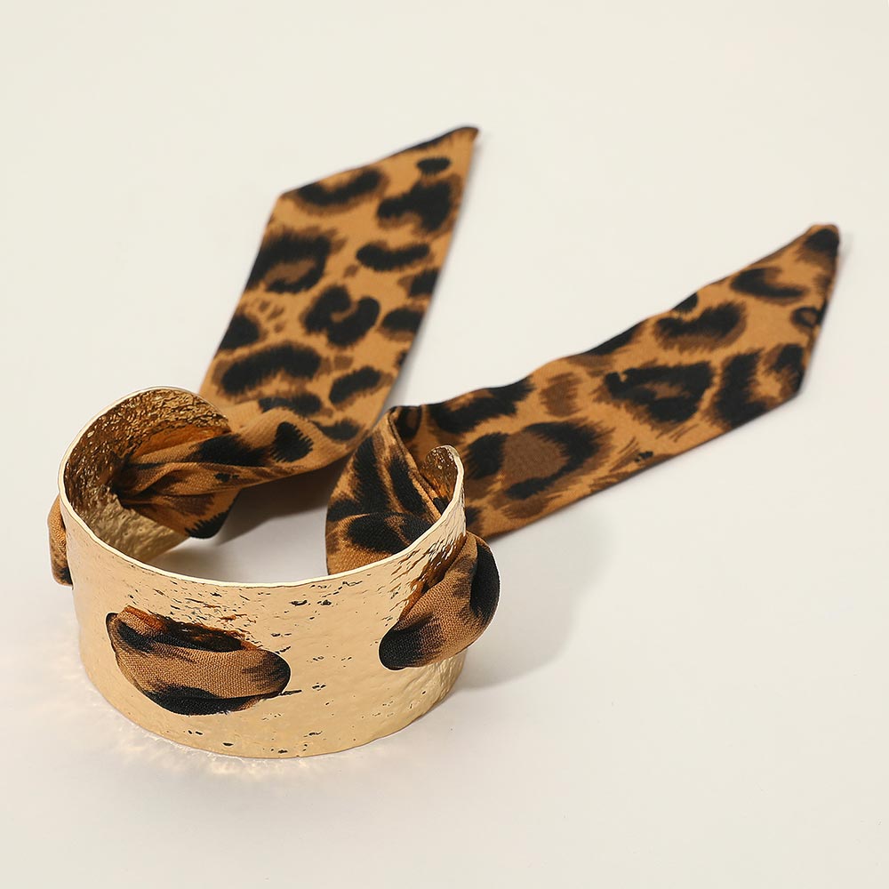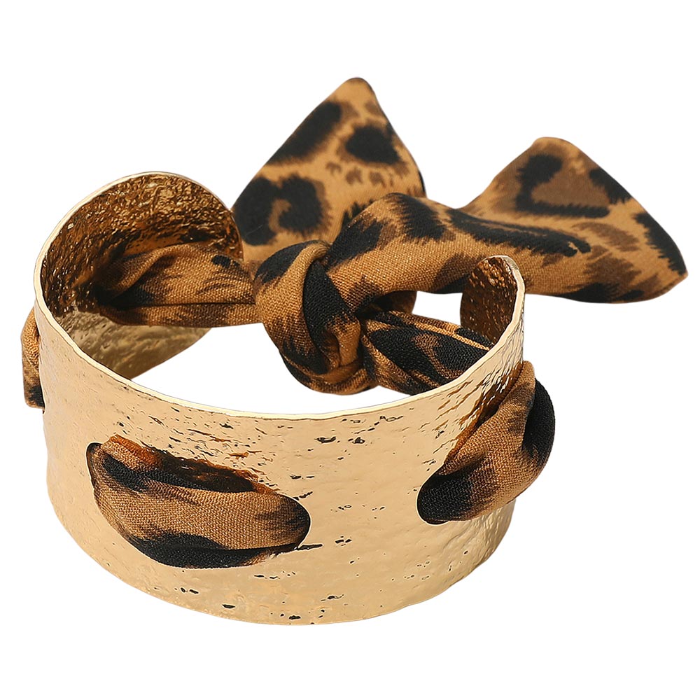 Details • Size : 1.4" H, 2.5" D • Fabric Scarf Size : 18" L / Adjustable • Water Resistant • Elevate your style with this hammered metal cuff bracelet featuring a bold fabric bow accent. Its adjustable design and textured finish create a perfect balance of elegance and edge, making it an ideal accessory for casual or sophisticated looks. • Hypoallergenic • Stainless Steel