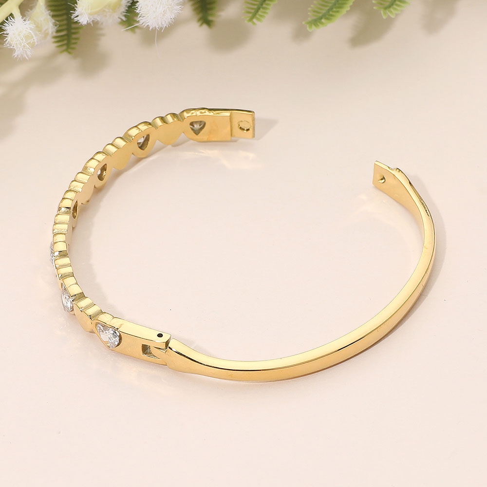 • Romantic hinge bangle bracelet featuring a row of polished heart motifs accented with sparkling crystals for elegant shine and sentiment. Designed for effortless wear, it complements everyday outfits or special-occasion looks with timeless charm when worn alone or layered.