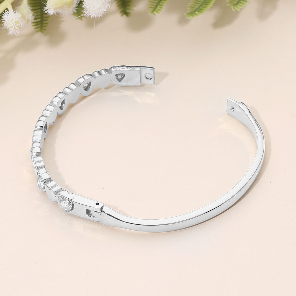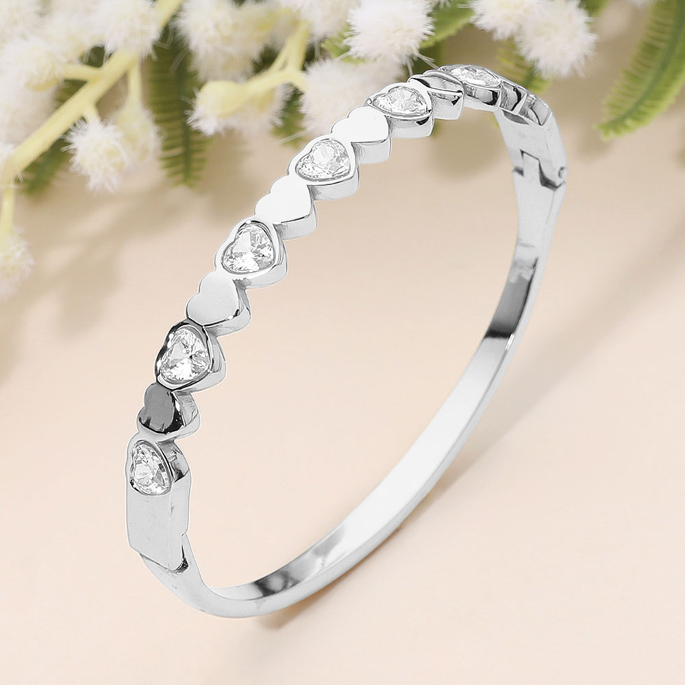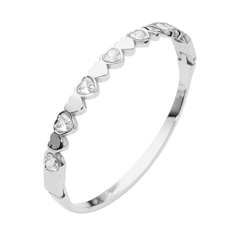 • Romantic hinge bangle bracelet featuring a row of polished heart motifs accented with sparkling crystals for elegant shine and sentiment. Designed for effortless wear, it complements everyday outfits or special-occasion looks with timeless charm when worn alone or layered.