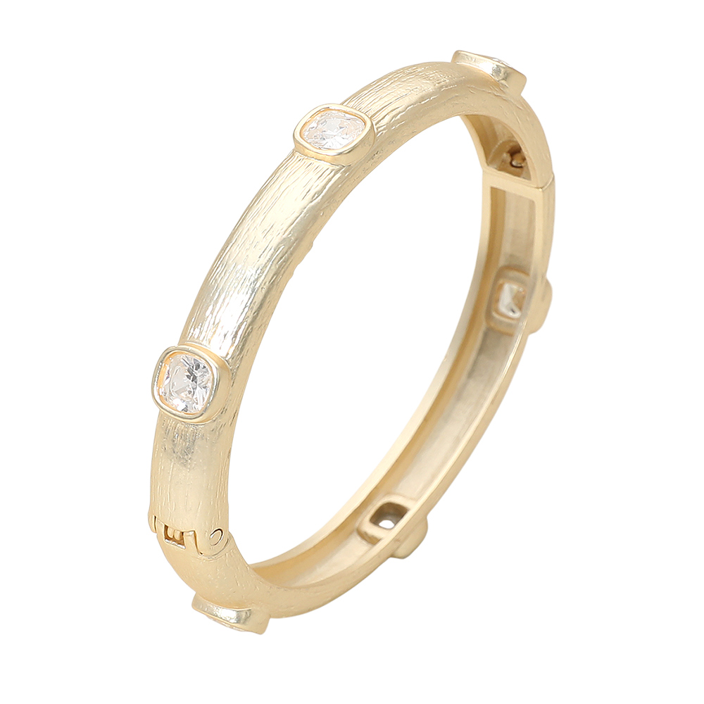 Details • Size : 0.3" H, 2.3" D • Hinged Closure • This Textured Bangle Bracelet exudes timeless charm with its refined finish and brilliant square cz accents. Designed for effortless sophistication, it adds a hint of sparkle to any look — perfect for elevating both everyday outfits and elegant evening ensembles. • CZ Cubic Zirconia