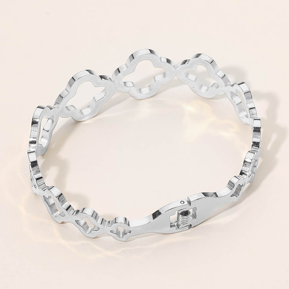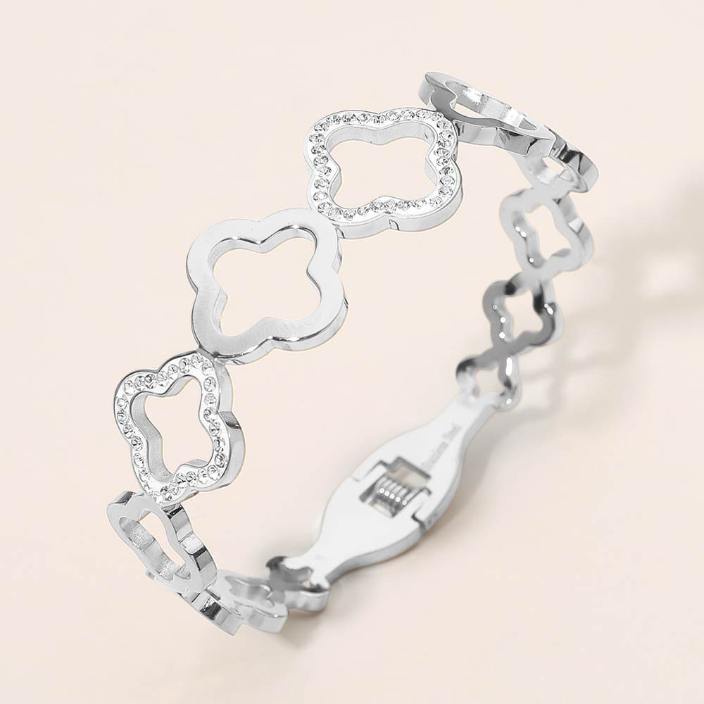 Details • Size : 0.75" H, 2.3" D • Hinged Closure • Elegant hinged bracelet featuring linked quatrefoil-inspired shapes accented with shimmering cz details. Designed for effortless wear and versatile styling, this bracelet adds refined charm to everyday looks or special occasions and pairs beautifully with other bracelets or stands out worn alone. • CZ Cubic Zirconia • Stainless Steel