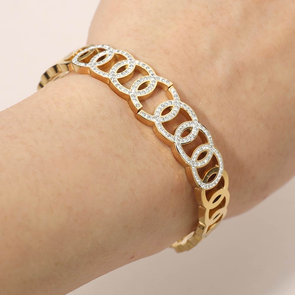 Details • Size : 0.5" H, 2.3" D • Hinged Closure • Sophisticated hinged bracelet designed with layered circle link shapes and sparkling cz accents. This sleek statement piece offers a polished look with easy wear, making it perfect for daily styling, evening outfits, or stacking with other bracelets for a refined, modern finish. • CZ Cubic Zirconia • Stainless Steel
