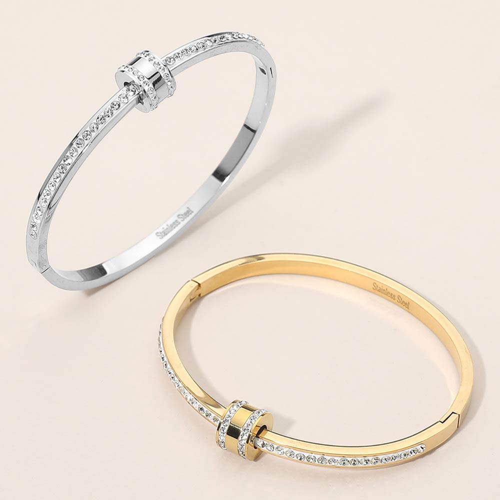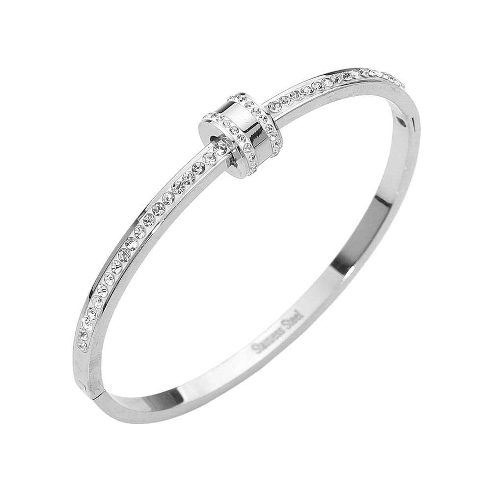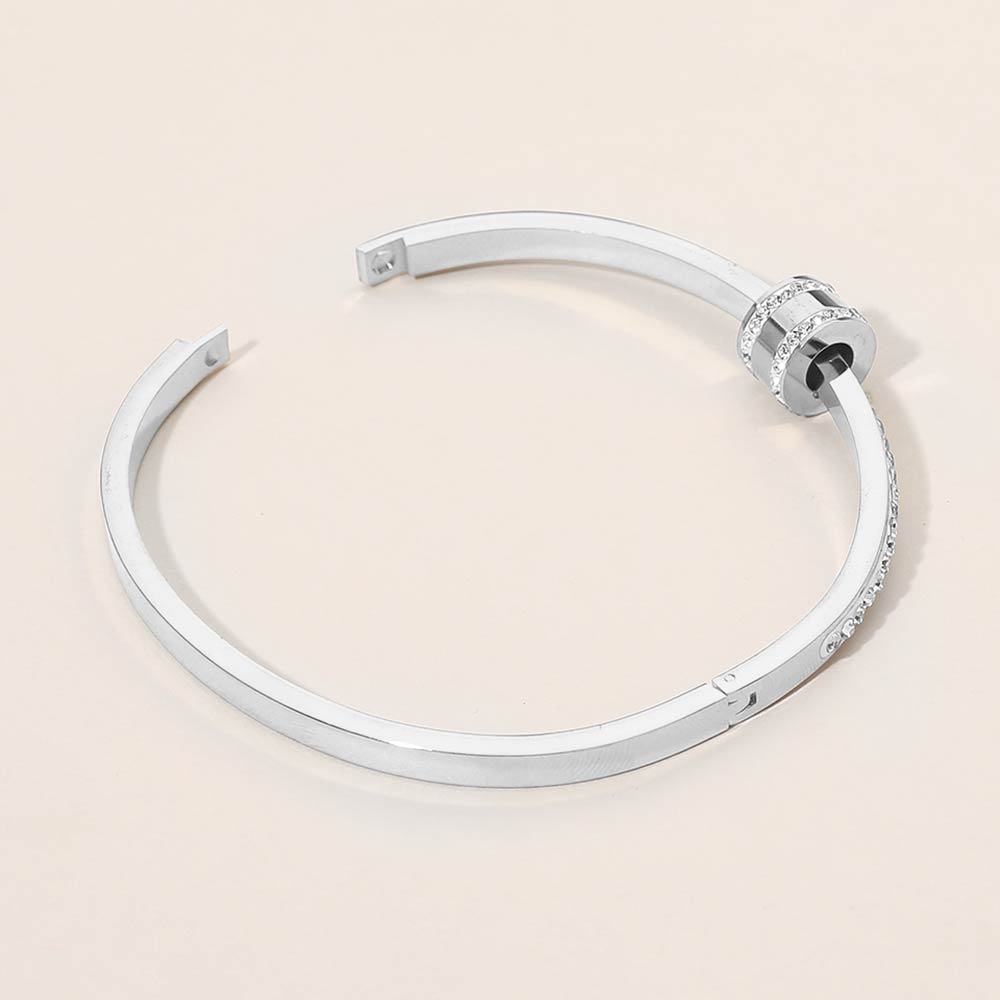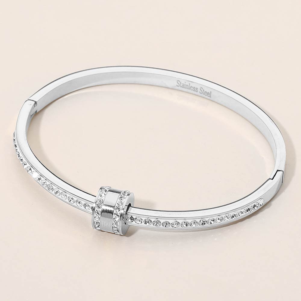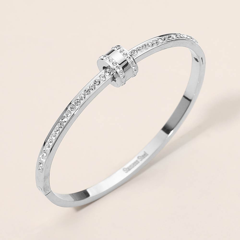 Details • Size : 0.4" H, 2.4" D • Hinged Closure • Sleek hinged bangle bracelet featuring a modern cz accent detail for a refined, polished look. Designed for easy wear and secure closure, this bracelet adds subtle sparkle and effortless elegance to everyday outfits, workwear, or evening styling. • CZ Cubic Zirconia • Stainless Steel