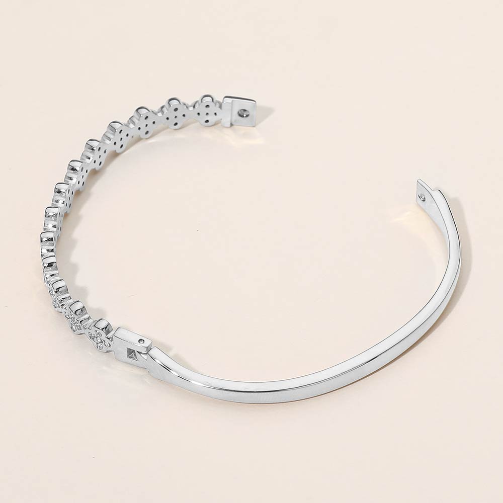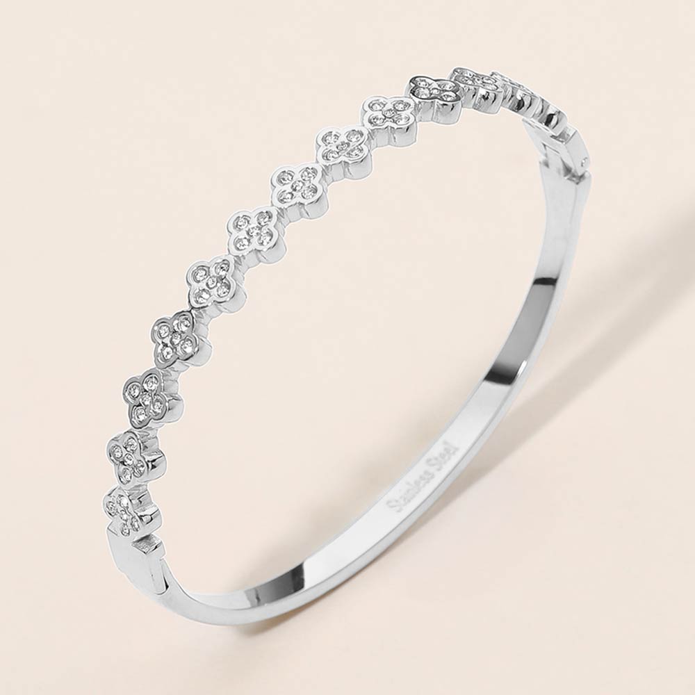 Details • Size : 0.25" H, 2.4" D • Hinged Closure • Delicate hinged bracelet designed with repeating quatrefoil station accents and subtle cz details. This elegant bracelet offers a refined, feminine look that pairs effortlessly with casual outfits, office wear, or special occasions while providing comfortable, secure everyday styling. • CZ Cubic Zirconia • Stainless Steel