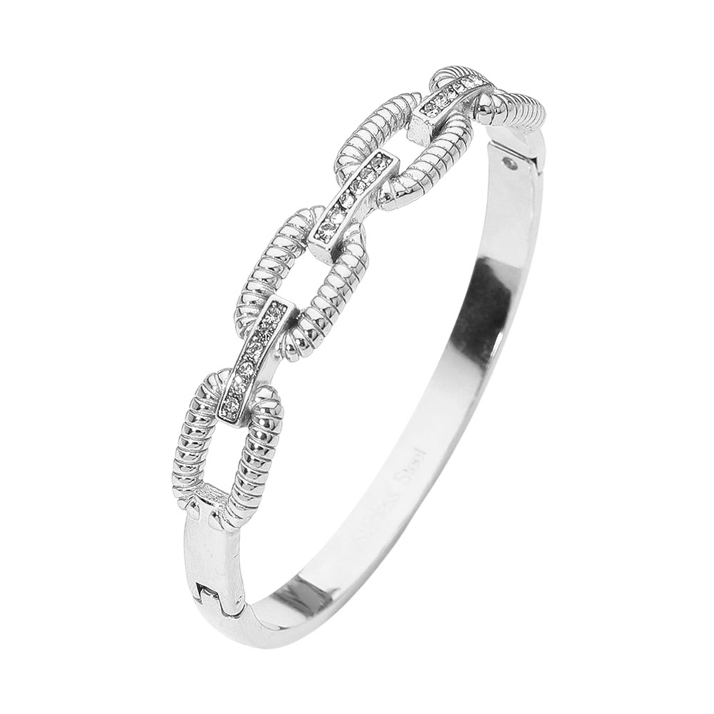 Details • Size : 0.4" H, 2.3" D • Hinged Closure • Statement bangle designed with bold interlocking link details and subtle accent sparkle for a sophisticated, modern finish. Easy to wear and comfortable for daily styling, perfect for stacking or as a standout solo piece to elevate casual and dress outfits alike. • CZ Cubic Zirconia • Stainless Steel