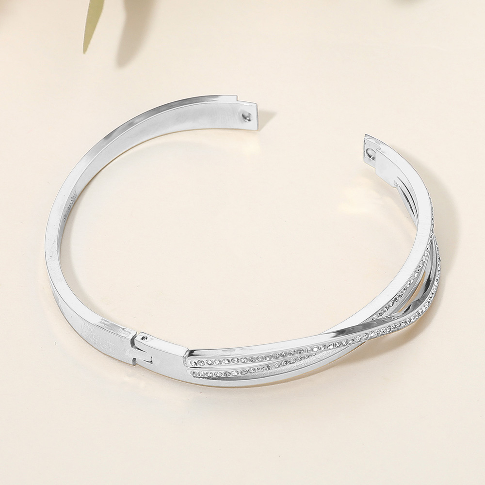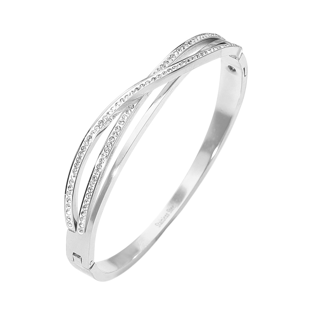 Details • Size : 0.4" H, 2.4" D • Hinged Closure • Elevate your style with this crystal crossover hinged bangle bracelet. Its sleek layered design with sparkling accents makes it the perfect statement piece for both casual and formal outfits. A timeless bracelet that blends modern elegance with lasting sophistication. • CZ Cubic Zirconia • Stainless Steel