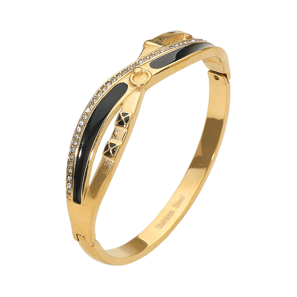 Details • Size : 0.6" H, 2.5" D • Hinged Closure • Modern bangle bracelet featuring geometric detailing and sleek contrasting inlay with a sparkling accent line. Designed with a secure hinged closure, this sophisticated piece adds a refined edge to both everyday looks and evening ensembles. • CZ Cubic Zirconia • Stainless Steel