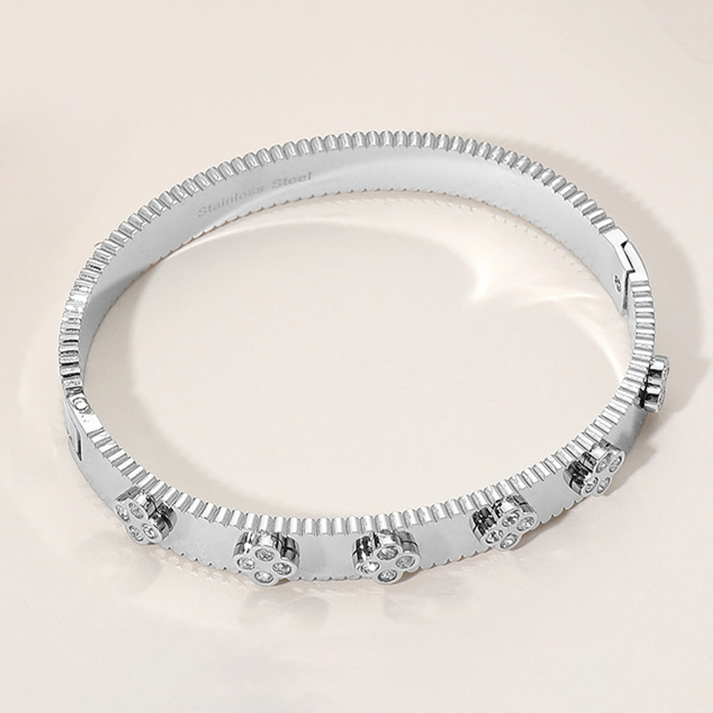 Details • Size : 0.3" H, 2.3" D • Hinged Closure • This elegant bangle bracelet features sparkling crystal flower accents set along a sleek band with refined textured edges. Its timeless design blends sophistication and charm, making it a versatile accessory for both casual wear and special occasions. • Stainless Steel