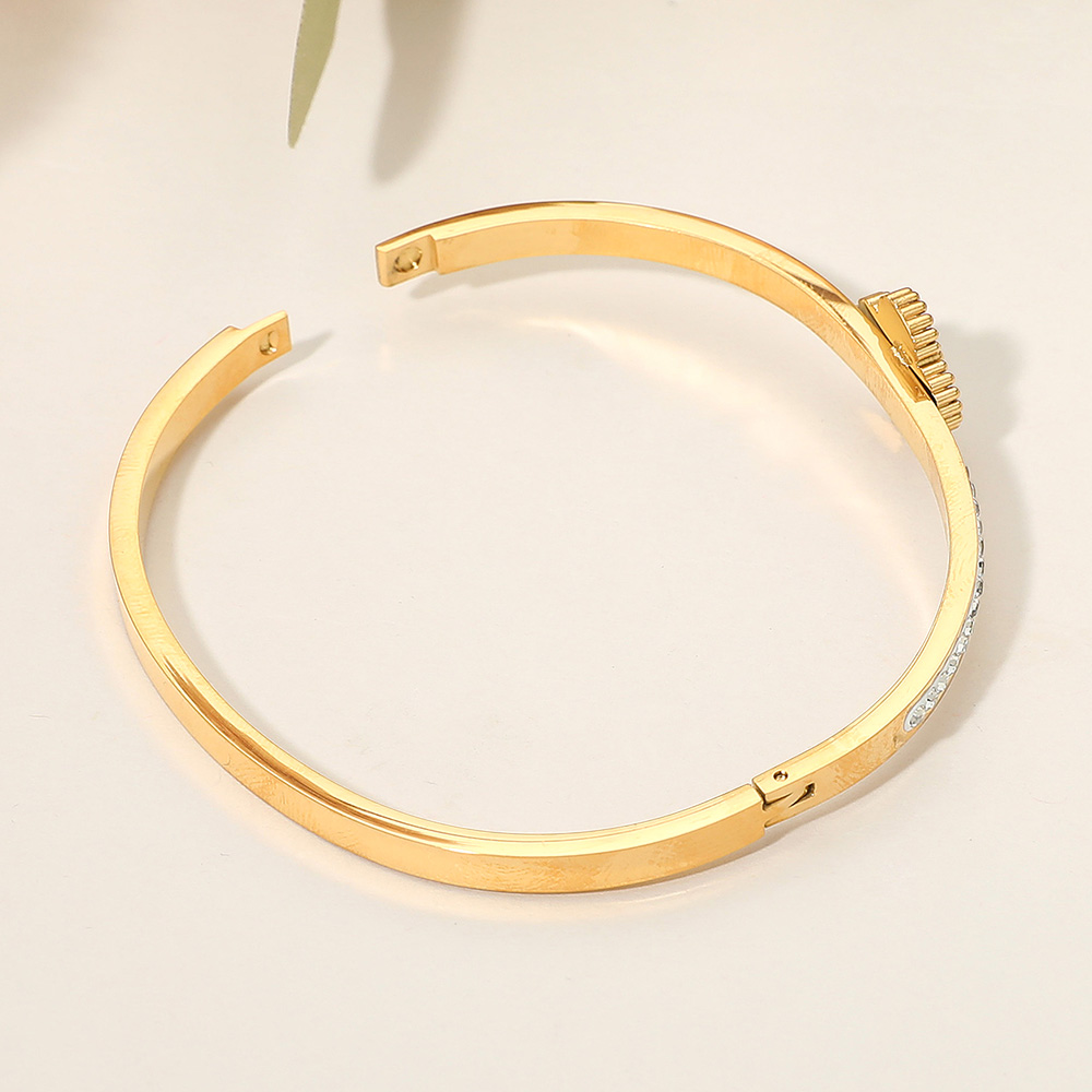 Stainless Steel Rhinestone Paved Quatrefoil Center Hinged Bangle Bracelet