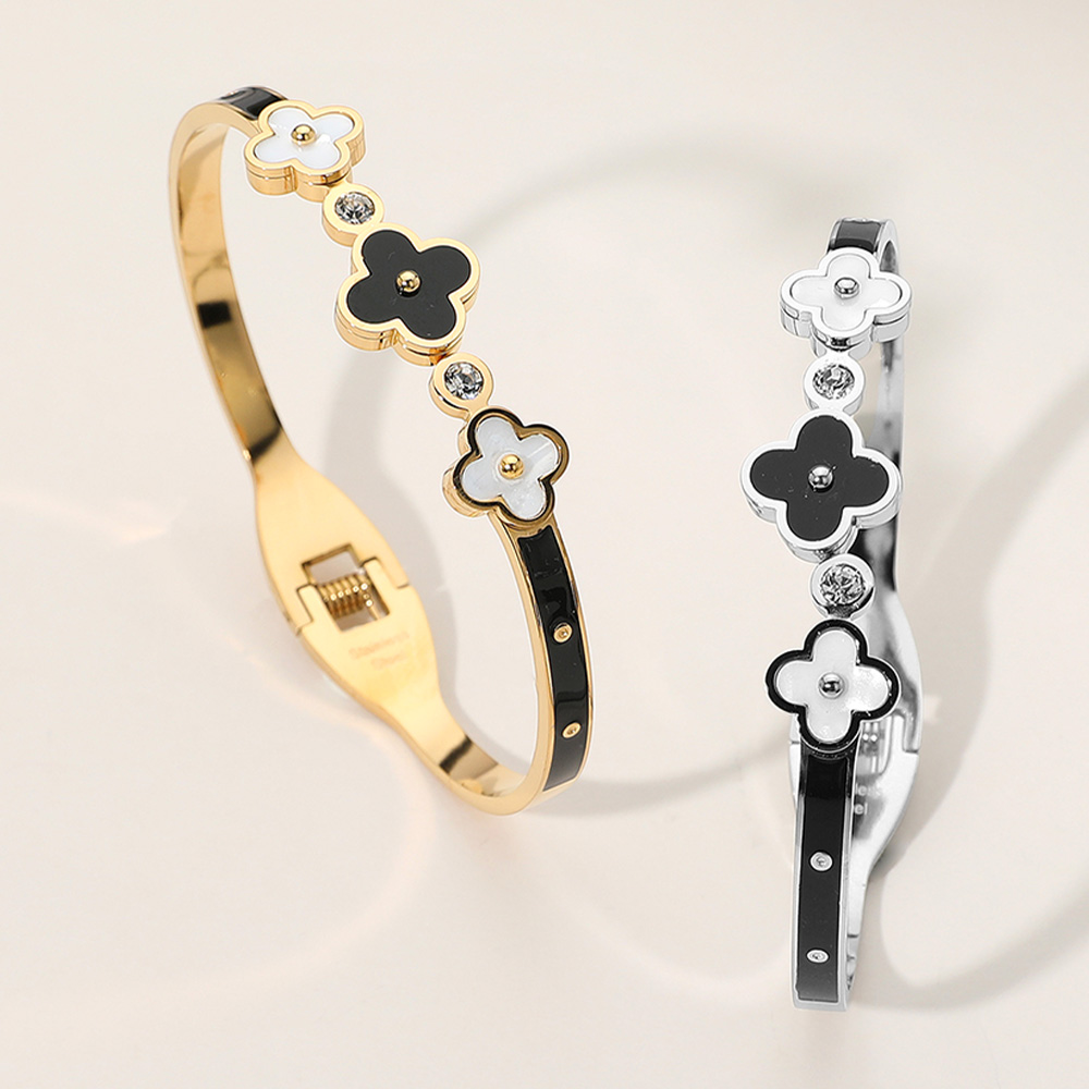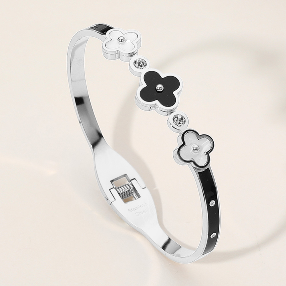 Details • Size : 0.5" H, 2.4" D • Hinged Closure • Refined and stylish, this clover bangle bracelet features alternating quatrefoil motifs with sparkling crystal accents. Its sleek design brings a touch of modern elegance, making it perfect for both everyday wear and special occasions. A versatile accessory that pairs beautifully with any outfit. • Stainless Steel