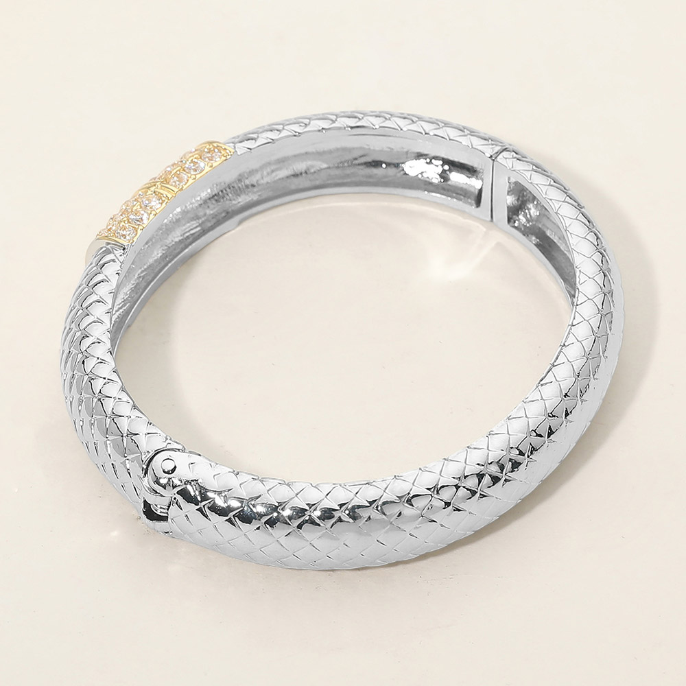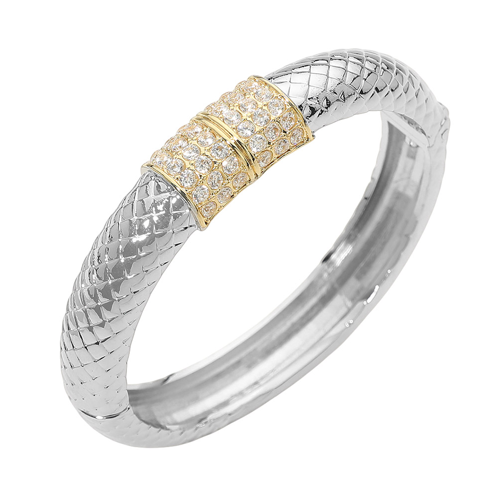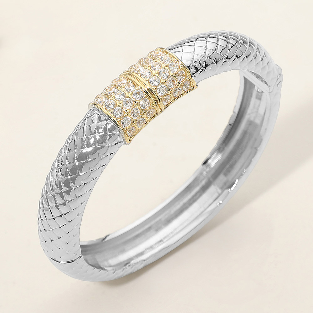 Details • Size : 0.5" H, 2.5" D • Hinged Closure • Elegant hinged bangle bracelet designed with a textured finish and a sparkling center accent for elevated everyday styling. Structured silhouette offers a secure fit and polished look. Perfect for wearing alone or stacking, ideal for boutiques seeking refined statement jewelry. • CZ Cubic Zirconia