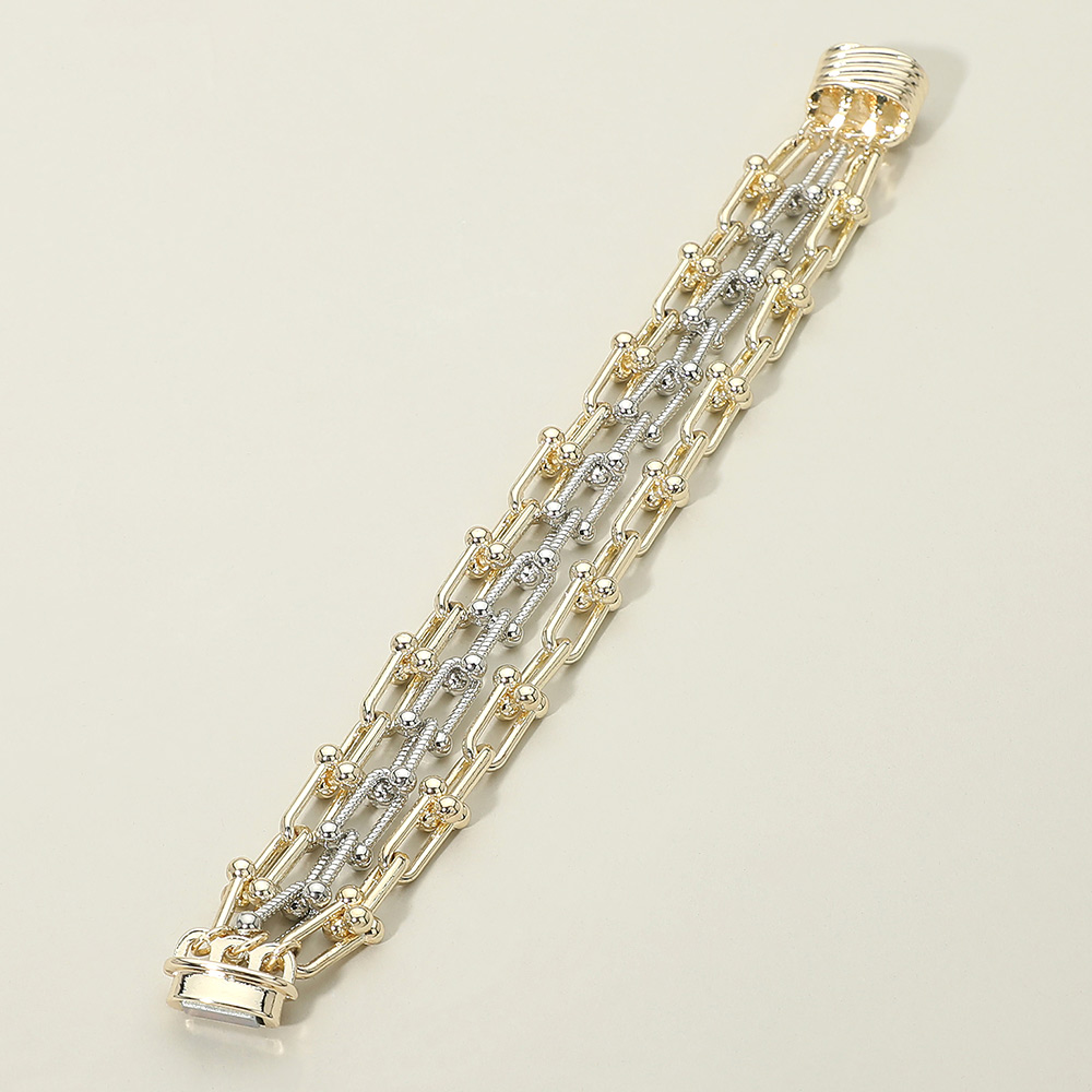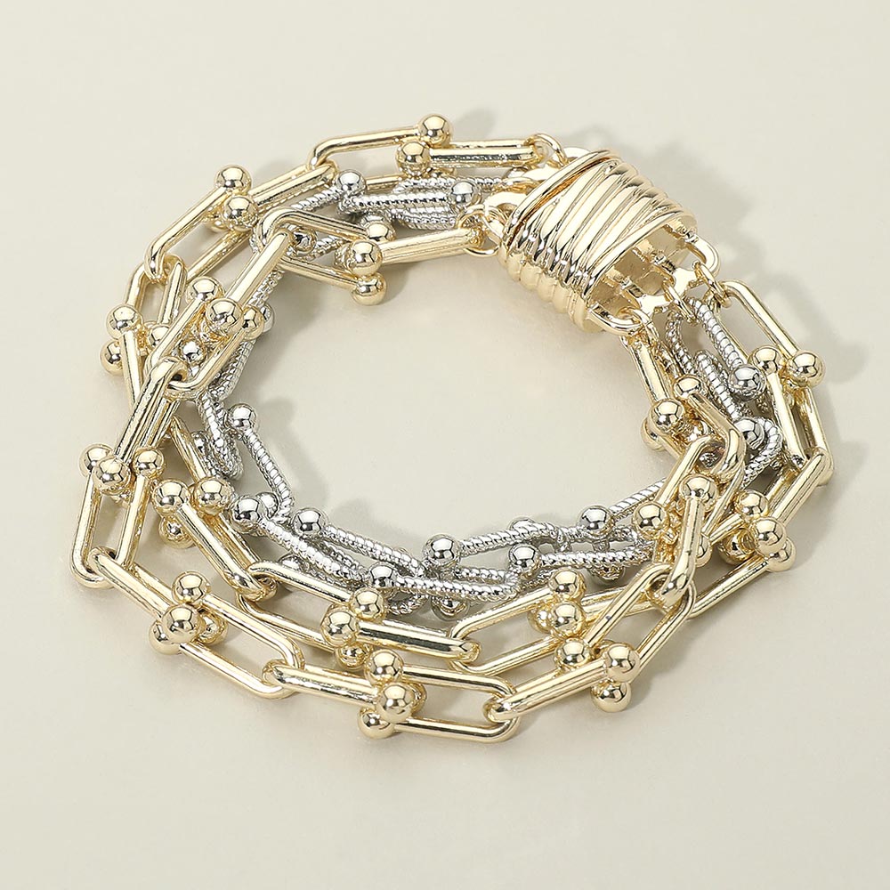 Details • Size : 0.9" H, 8" L • Magnetic Closure • Bold multi-layer chain bracelet designed with mixed link textures and a secure magnetic closure for effortless wear. This statement bracelet delivers a stacked, dimensional look that elevates casual outfits and trend-driven accessory collections with modern appeal. • Gold Dipped
